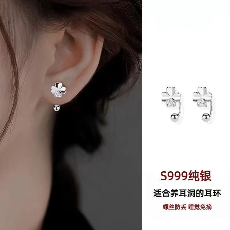 足银999四叶草镶钻半圆螺丝耳钉