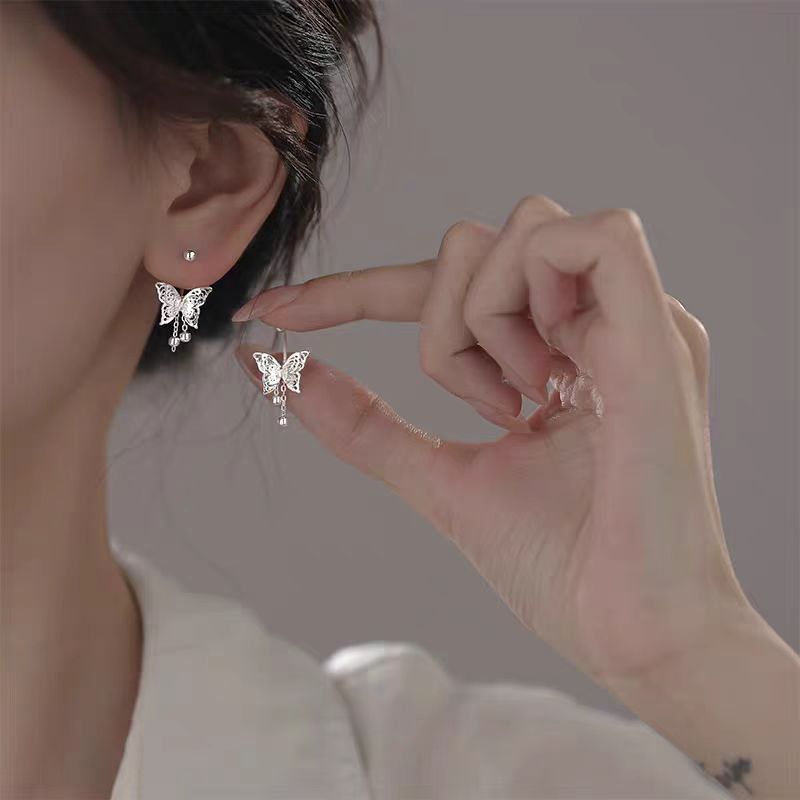 6551 純銀 999 ネジイヤリング中空蝶耳フック女の子新しいニッチデザインタッセルイヤリング