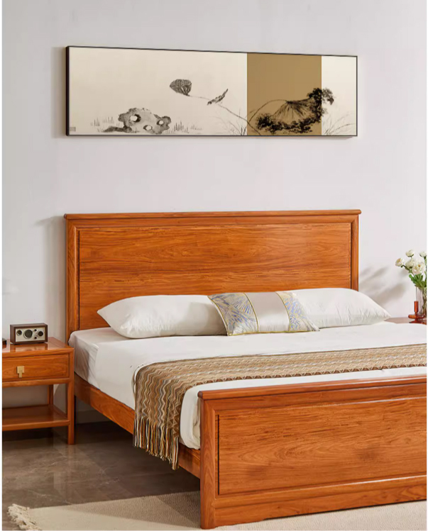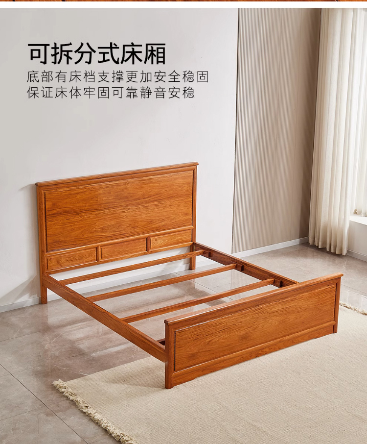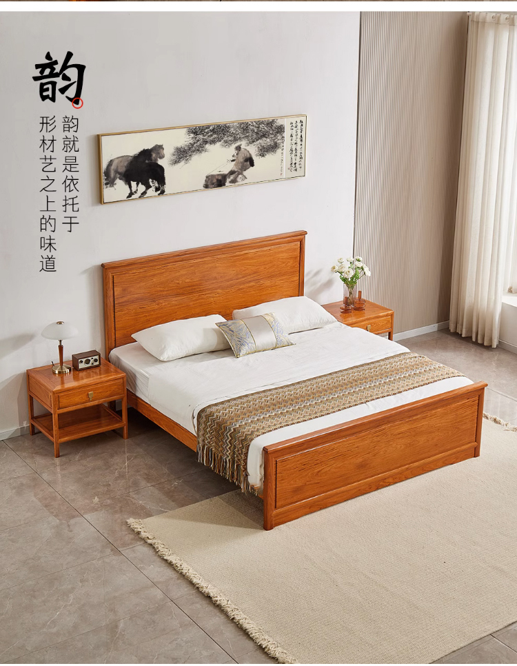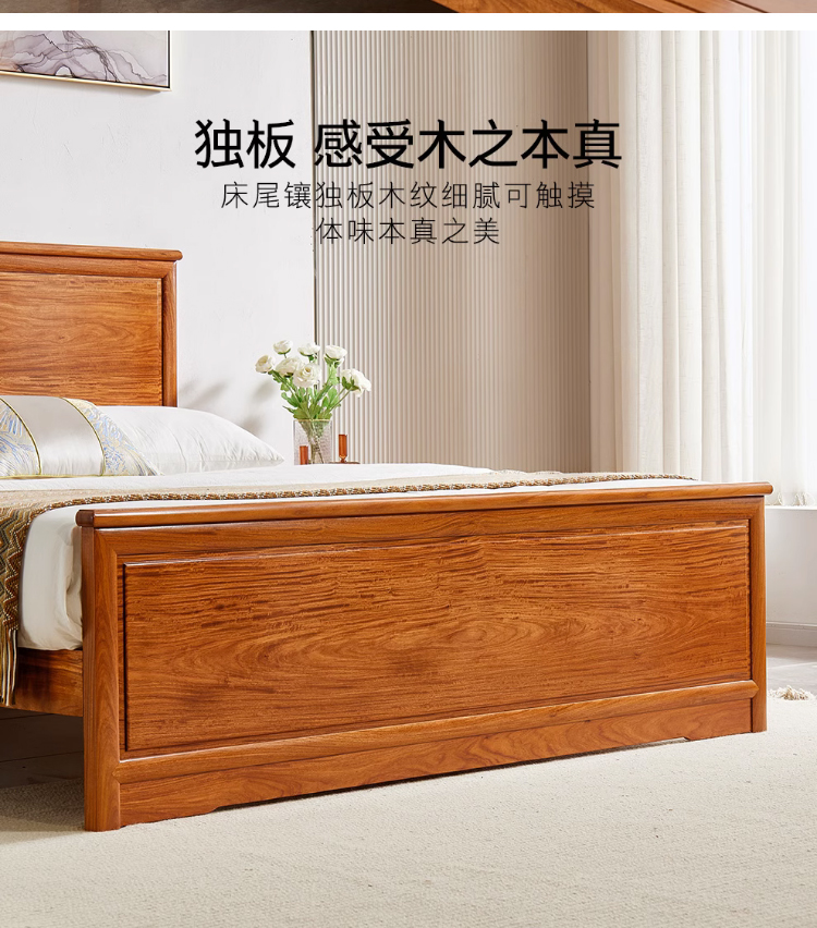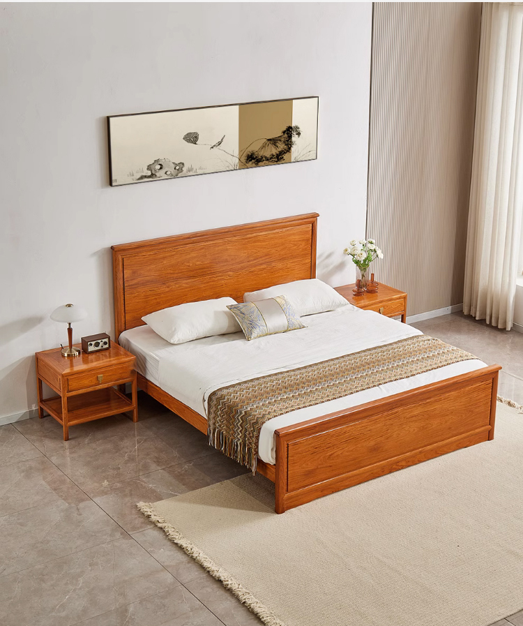 中国風のゴールデンウォールナットカラー無垢材ベッドマスターベッドルームほぞ穴 1.8x 2m シングルとダブルベッド家庭用収納ウェディングベッド