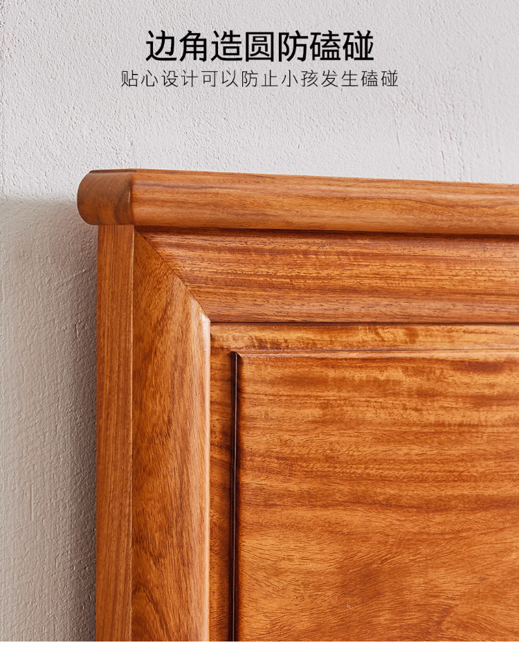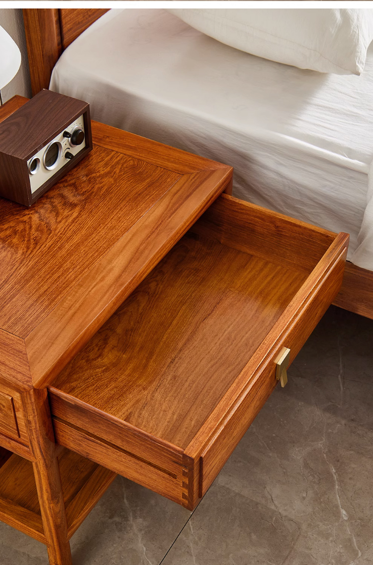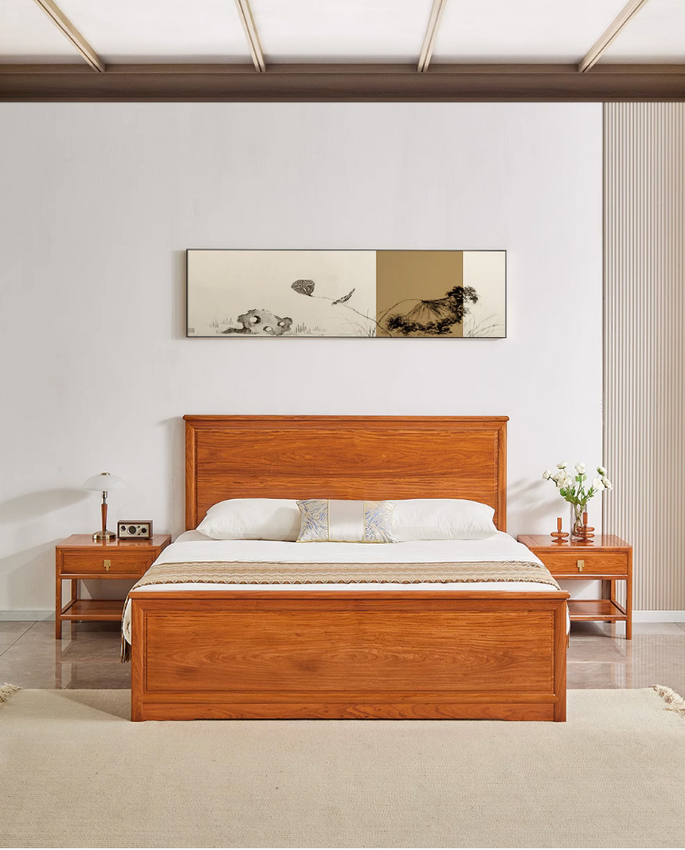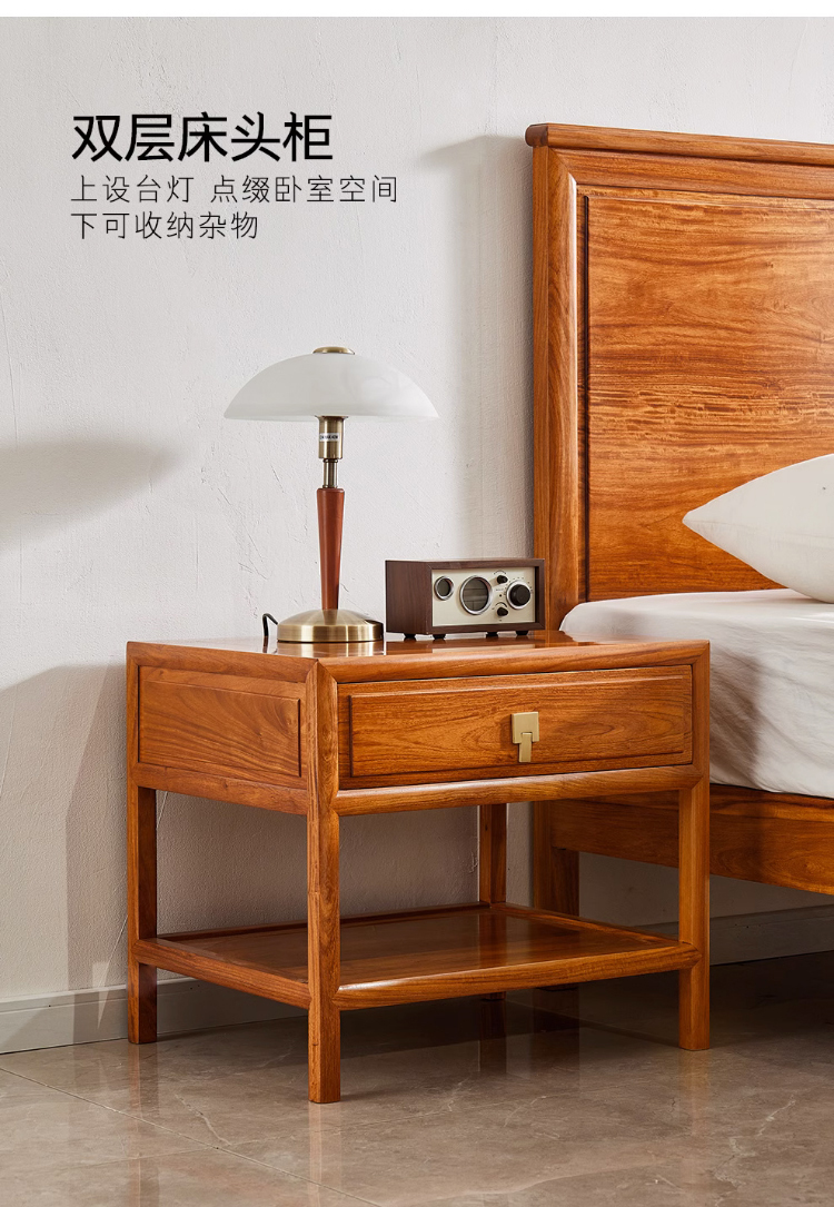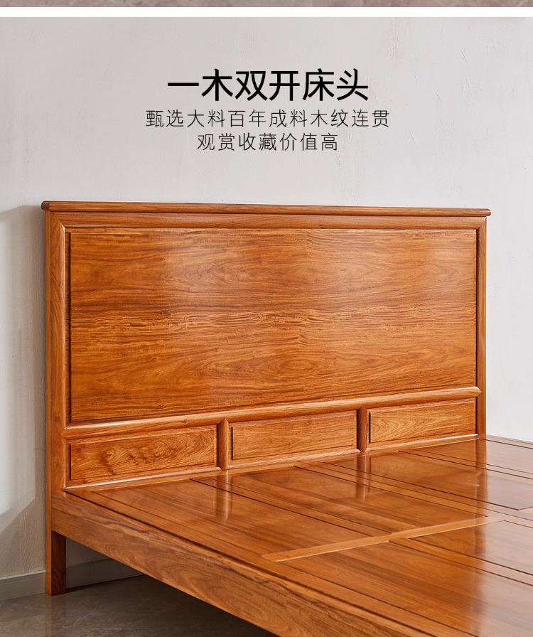 中国風のゴールデンウォールナットカラー無垢材ベッドマスターベッドルームほぞ穴 1.8x 2m シングルとダブルベッド家庭用収納ウェディングベッド