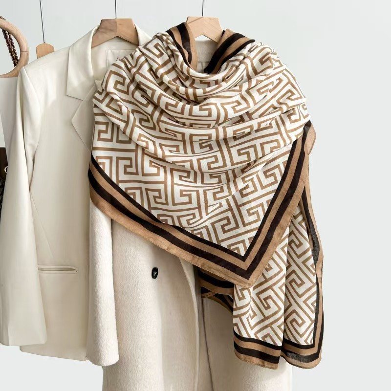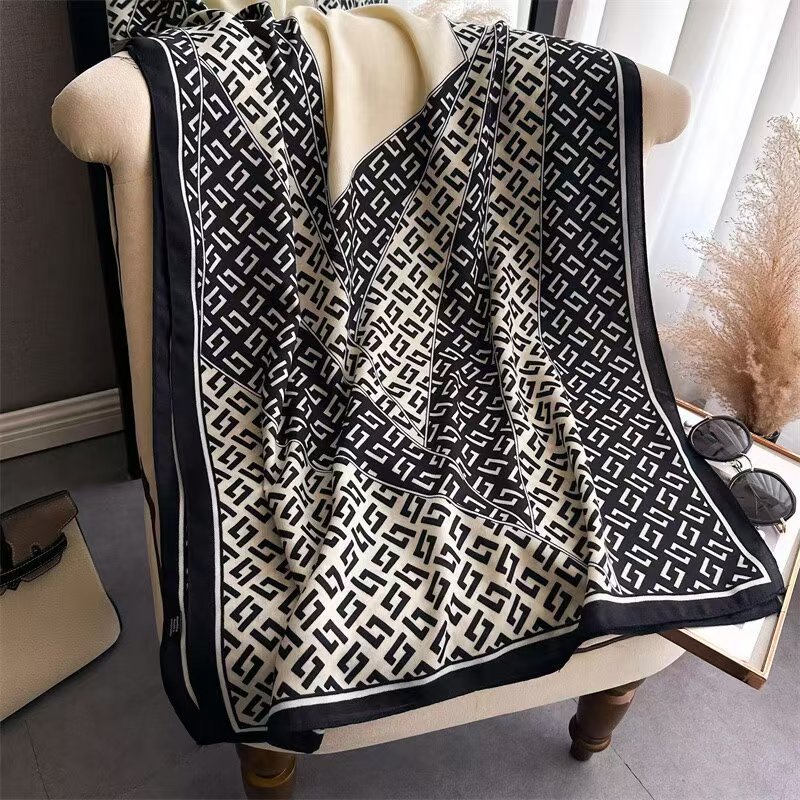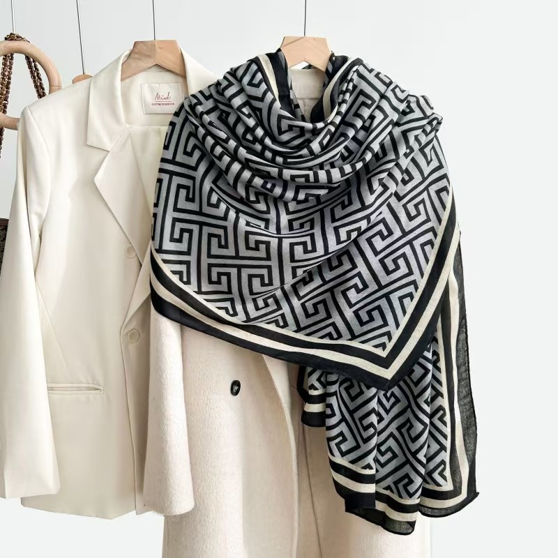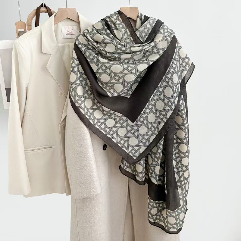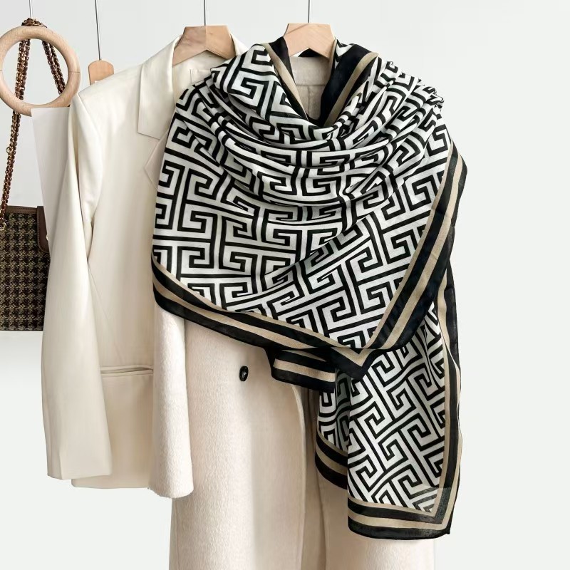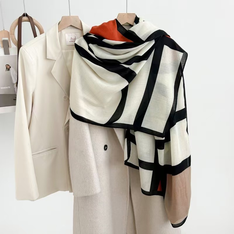 2024秋冬新作 ミニマリストスタイル 多用途 インス風 幾何学模様 ロングスカーフ エレガントな日焼け止めシルクスカーフ