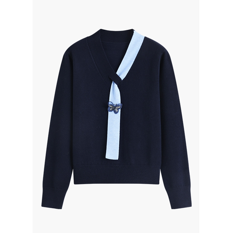 设计感小众撞色羊毛呢针织衫女2025年秋冬新款法式复古蝴蝶结上衣
