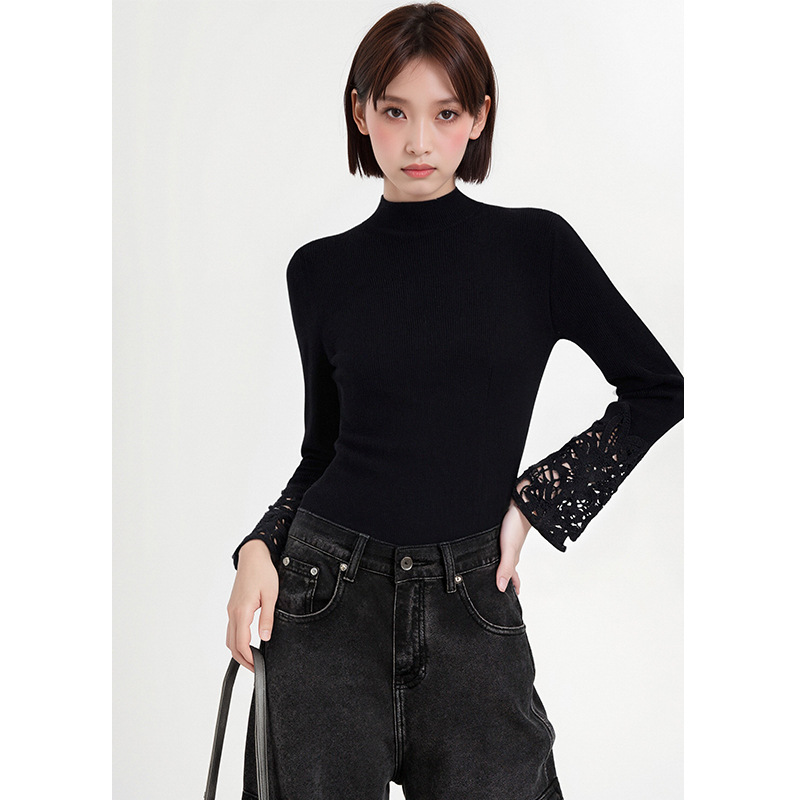 【朗*定单】设计感蕾丝拼接黑色针织衫女2025秋冬新款半高领上衣