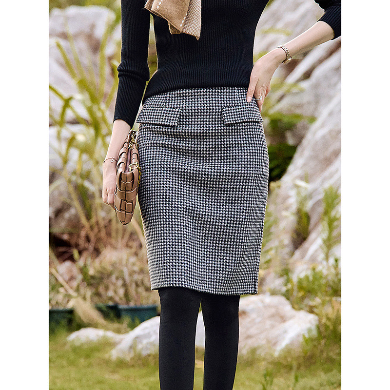 千鳥格の半身のスカートの女性の秋冬2023年の新型の高い腰はやせています。