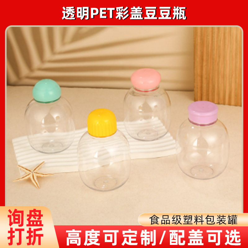透明PET彩盖豆豆瓶一次性网红食品包装塑料罐310ML零食糖果密封罐