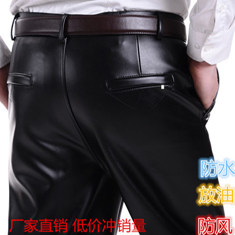 男性の皮のズボンの中で老年のゆったりしているストレートの筒は腰の黒色の耐摩耗性の防汚防水の油の労働保護の仕事のズボンを緩めます。