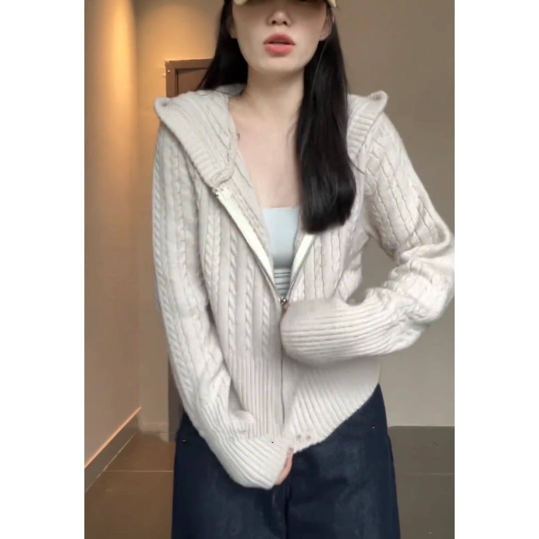 温柔麻花连帽针织开衫春秋韩系慵懒拉链羊毛外套毛衣收腰短款