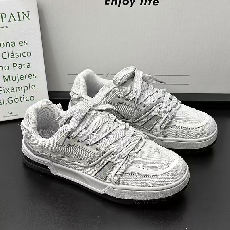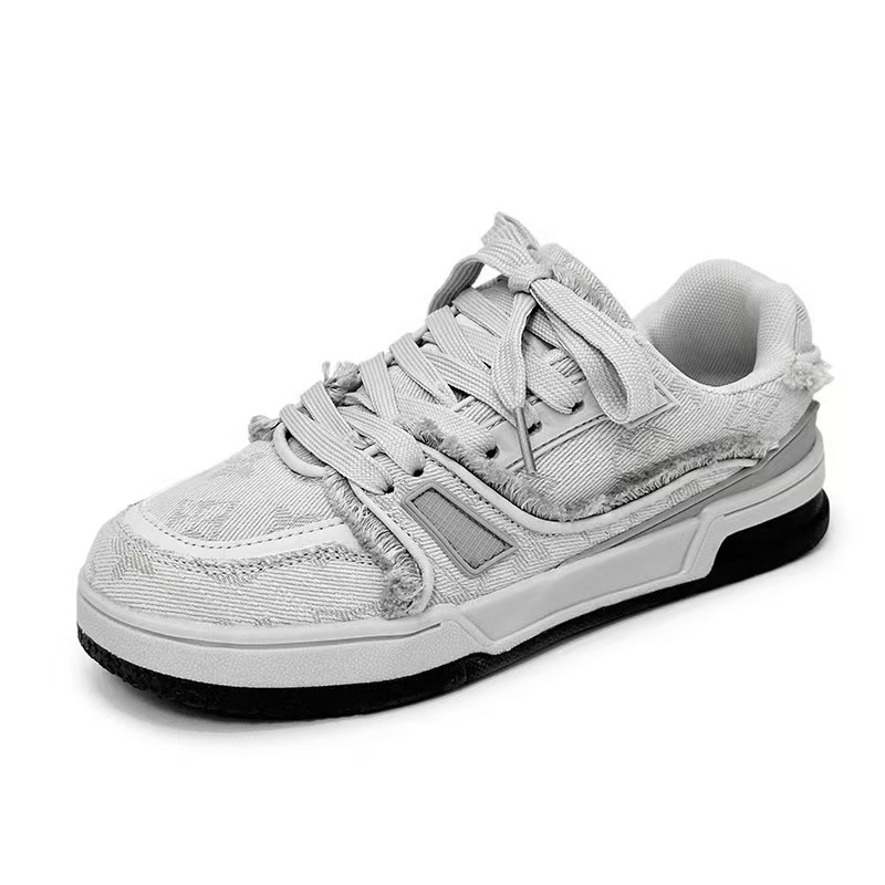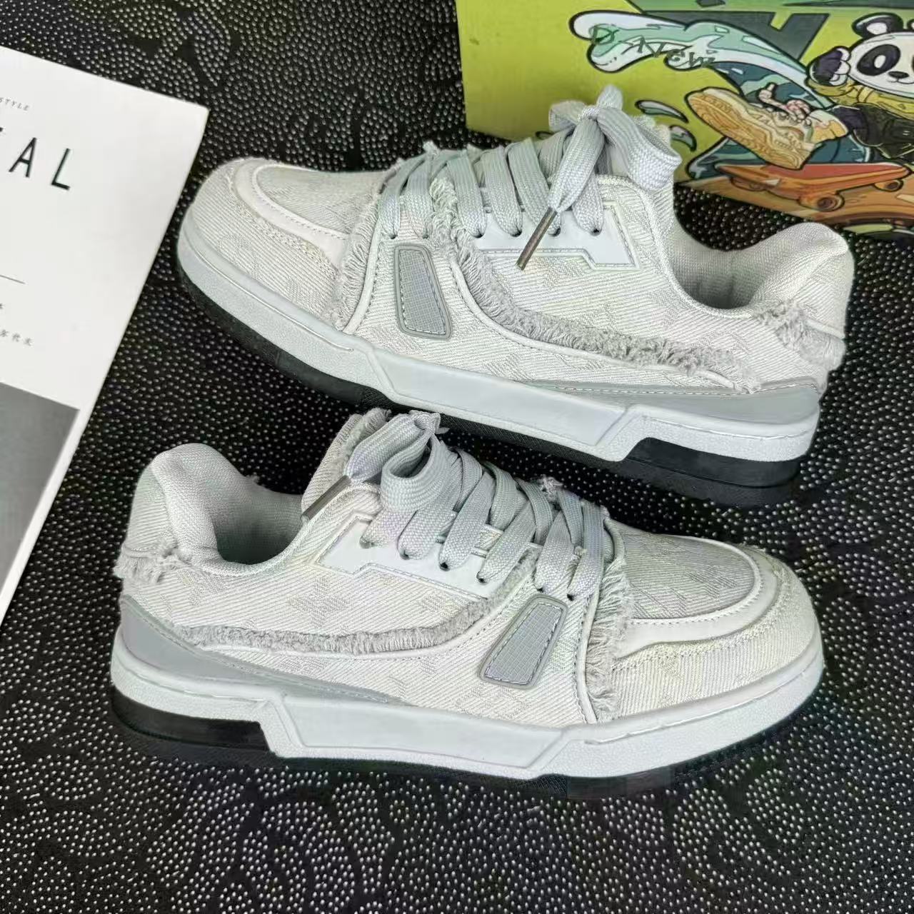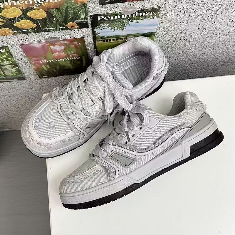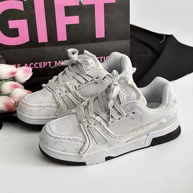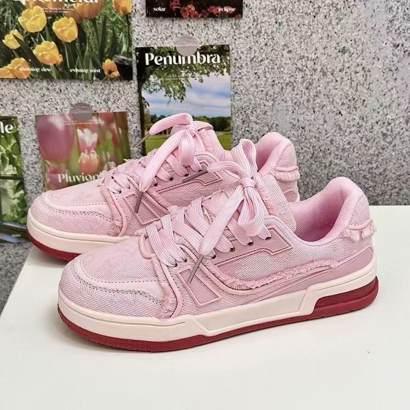 现货情侣小众运动休闲板鞋男夏粉色牛仔布须边复古面包鞋女款鞋子