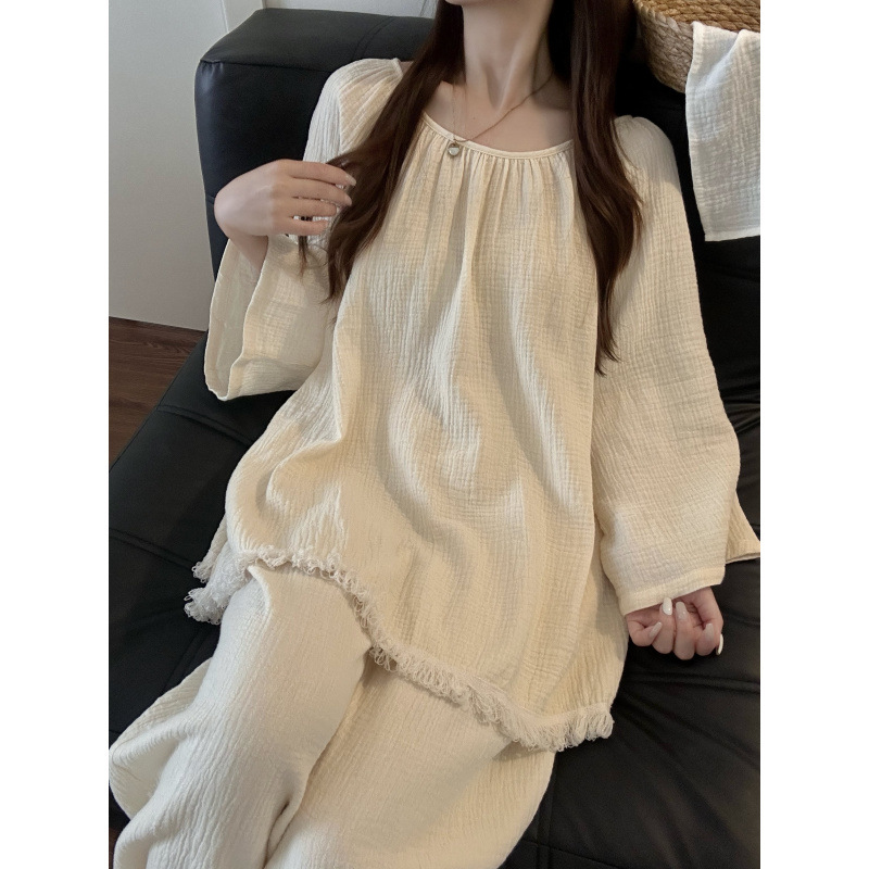 可爱蓝色流苏睡衣春秋季韩版长袖长裤薄款学生家居服套装跨境批发