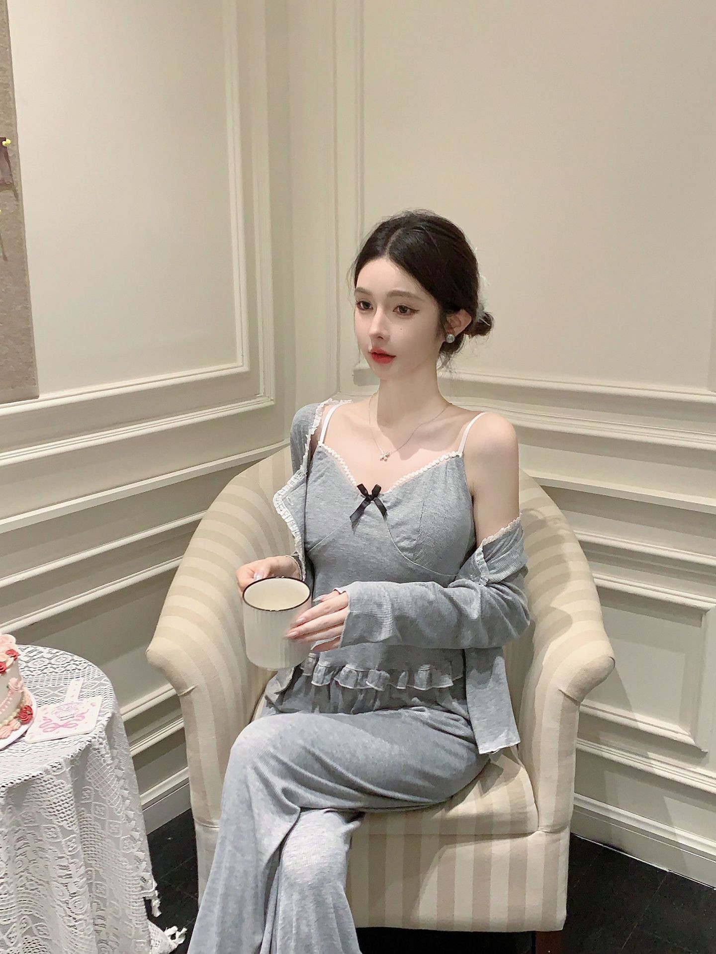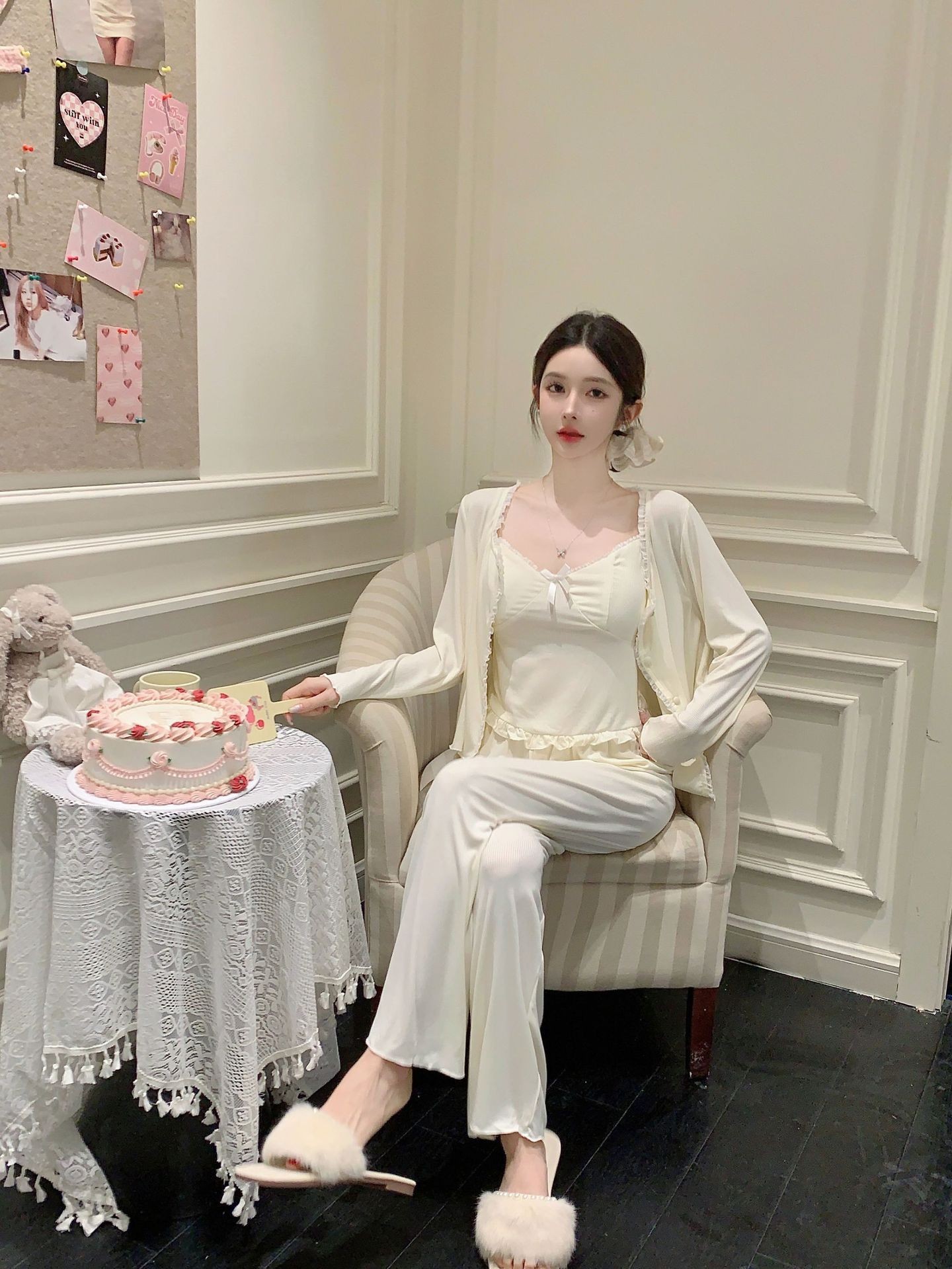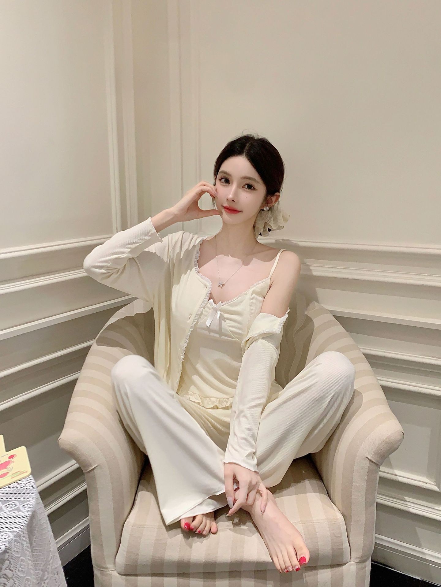 秋季新款睡衣女莫代尔三件套高级感长袖长裤简约居家服小香风带胸