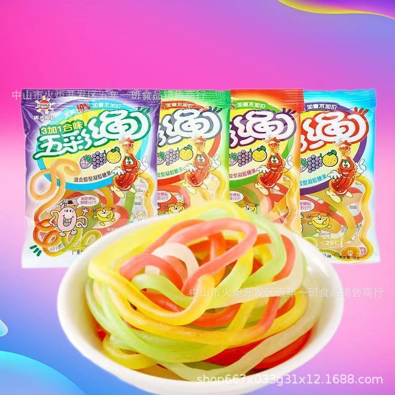 优卡五彩绳软糖面条糖彩虹跳跳绳糖橡皮糖Q糖皮筋儿童怀旧小零食