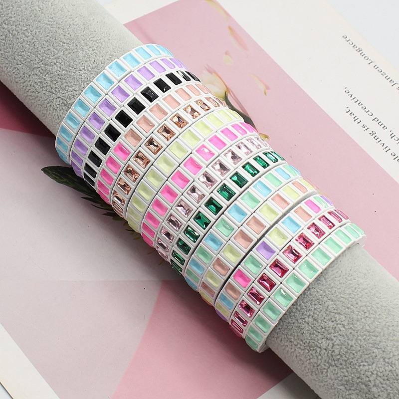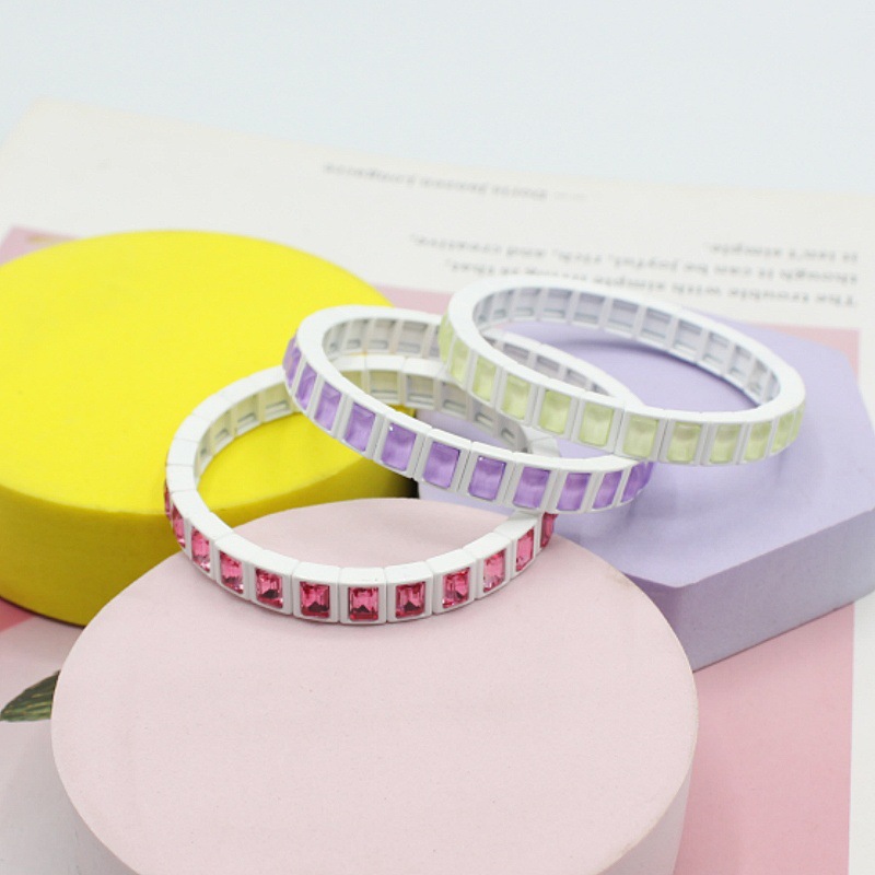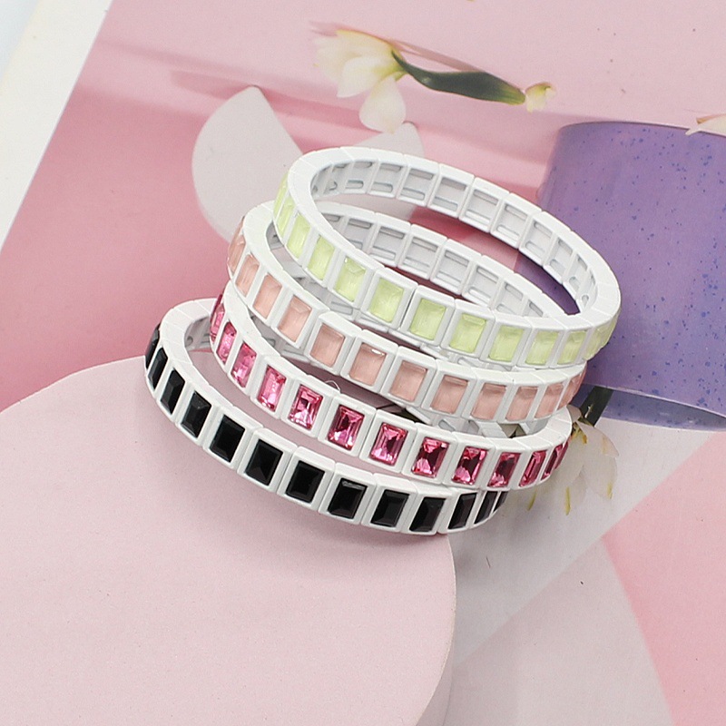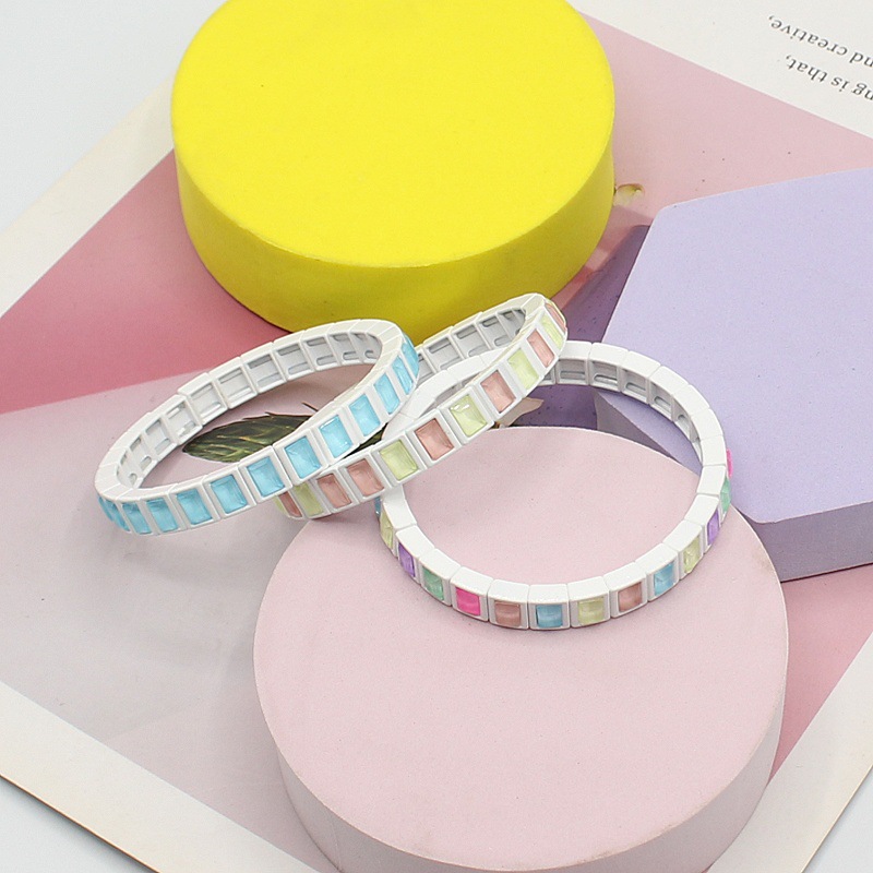 欧美时尚马卡龙色系多彩搪瓷几何四边形弹力手链女士时尚宝石手链