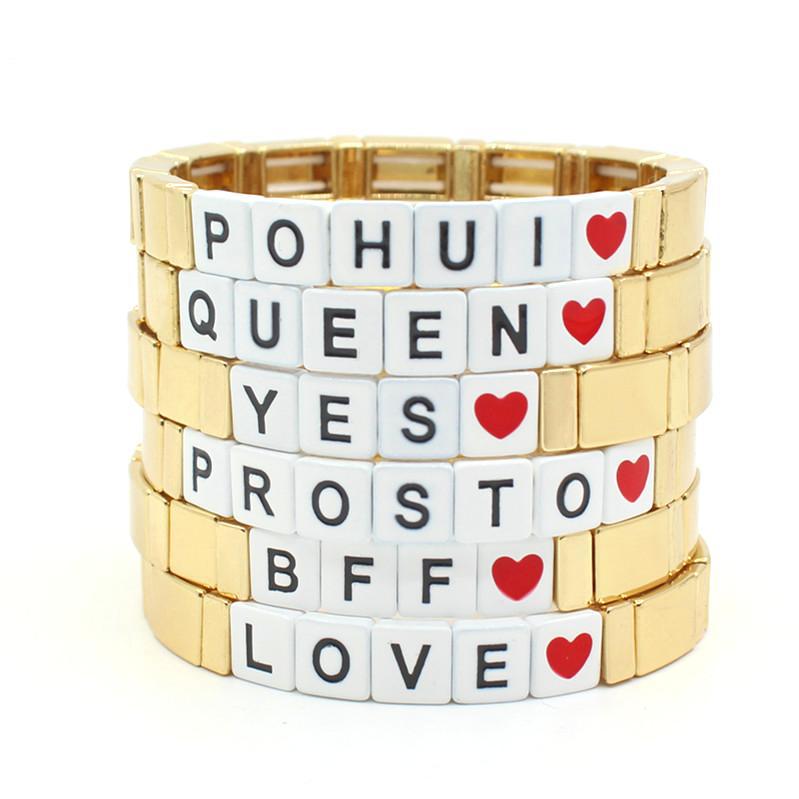 欧米の人気人気のある個性的なエナメルの金色のアルファベットの単語のブレスレットは、絵の油の桃の心のカップルの告白のブレスレットを重ねることができます。