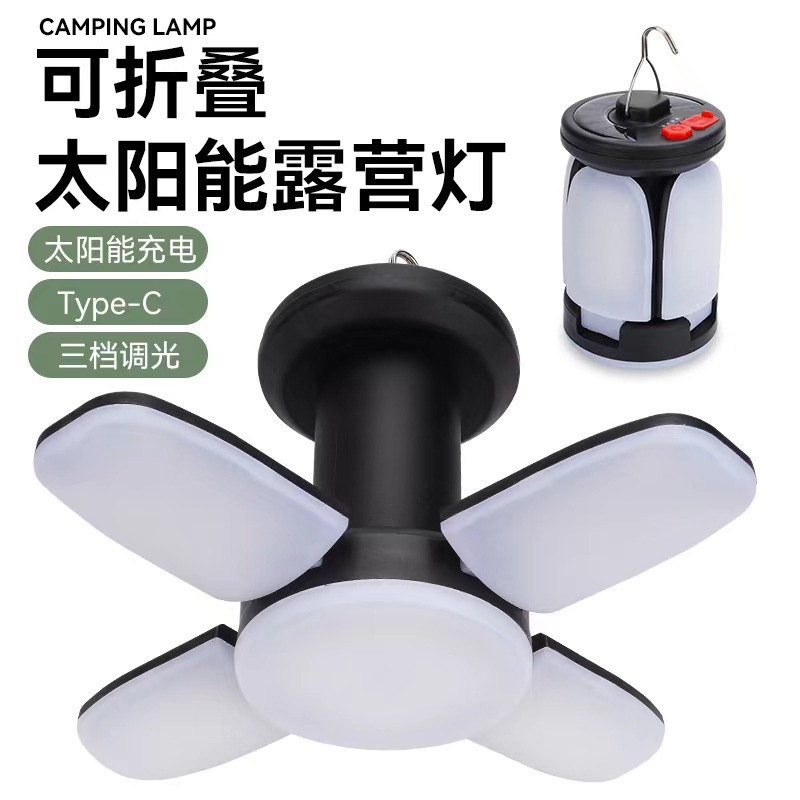 屋外折りたたみキャンプ用ライト、四葉ソーラーキャンプ用ライト、吊り下げ可能な強力な緊急ライト、USB充電式カーペットライト