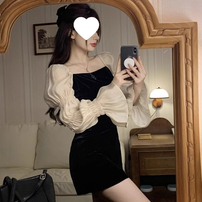 春と秋のフランスの気質のファッションは胸の小さい黒いスカートの女性の泡の袖の小さい贈り物のスカートの甘くて辛い風のセクシーな顕痩せのワンピースを塗ります。