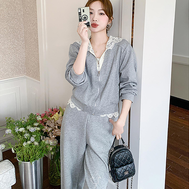 假两件蕾丝拼接连帽休闲套装女秋冬新款时尚轻熟风高腰阔腿裤套装