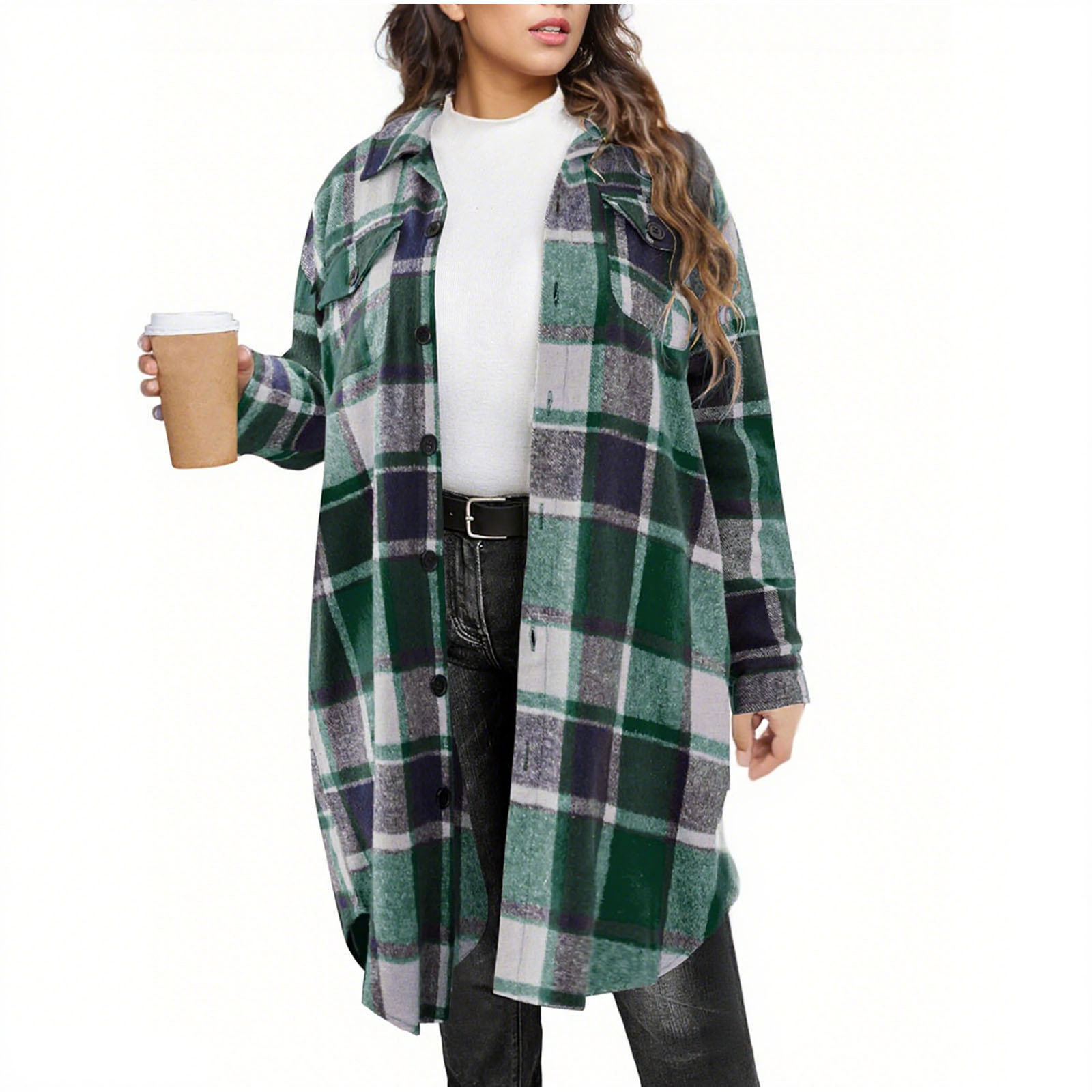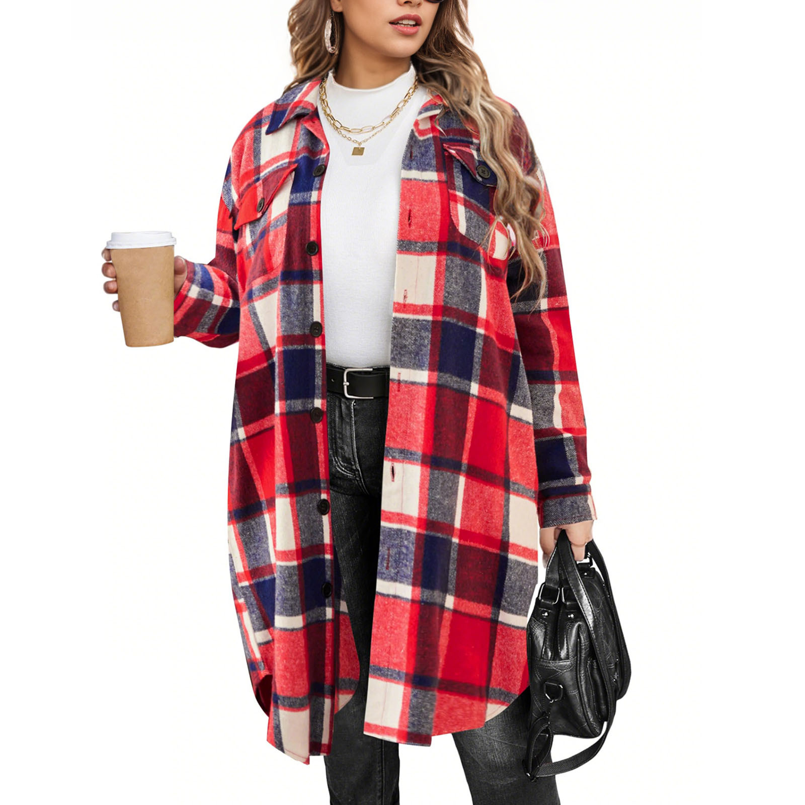 2025亚马逊跨境外贸大码女装中长款慵懒宽松秋冬格纹长袖毛呢外套