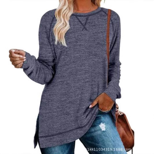 2025亚马逊跨境秋季新款拼色交叉宽松长袖休闲T恤开叉女上衣
