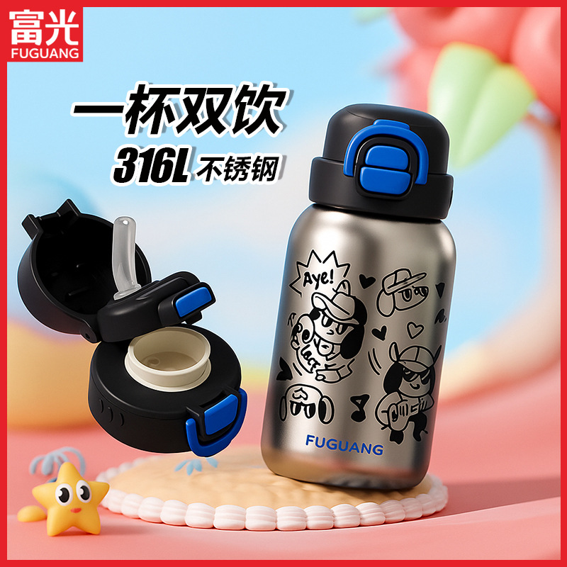 富光保温水筒 子供用食品グレード316Lステンレス製水筒 小学生用カップ カップカバー付き ストローカップ 卸売