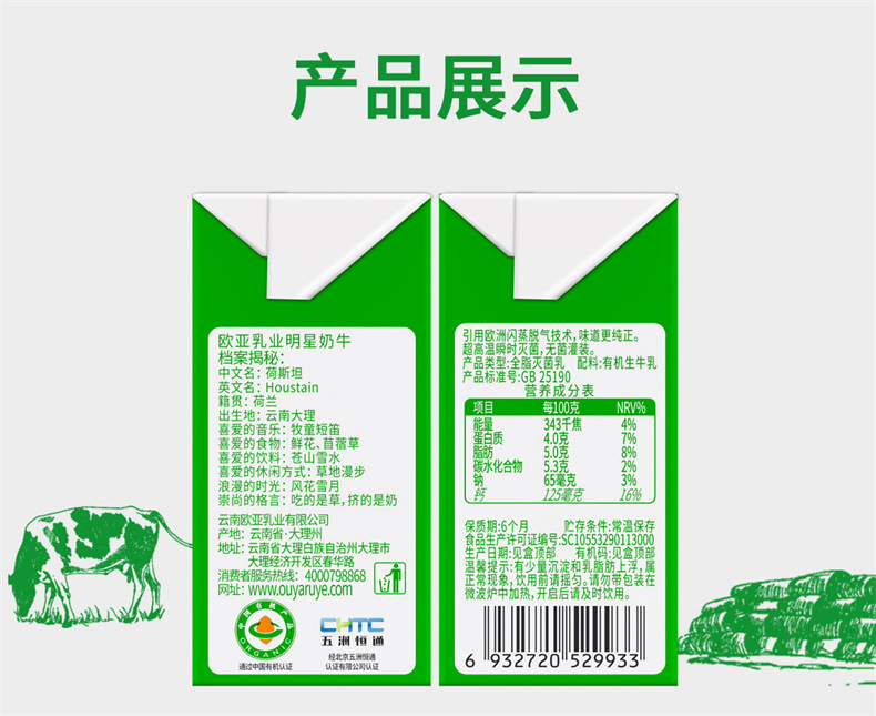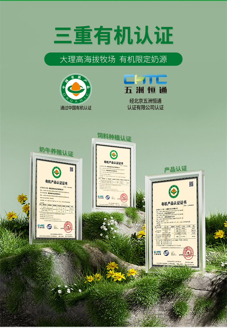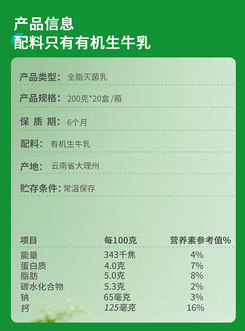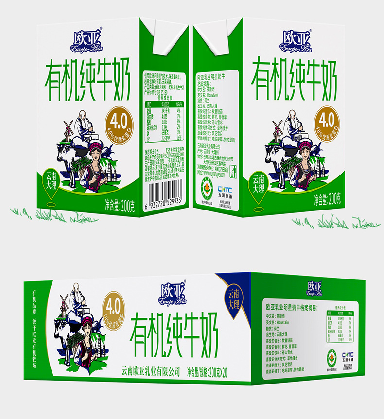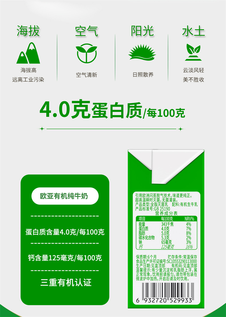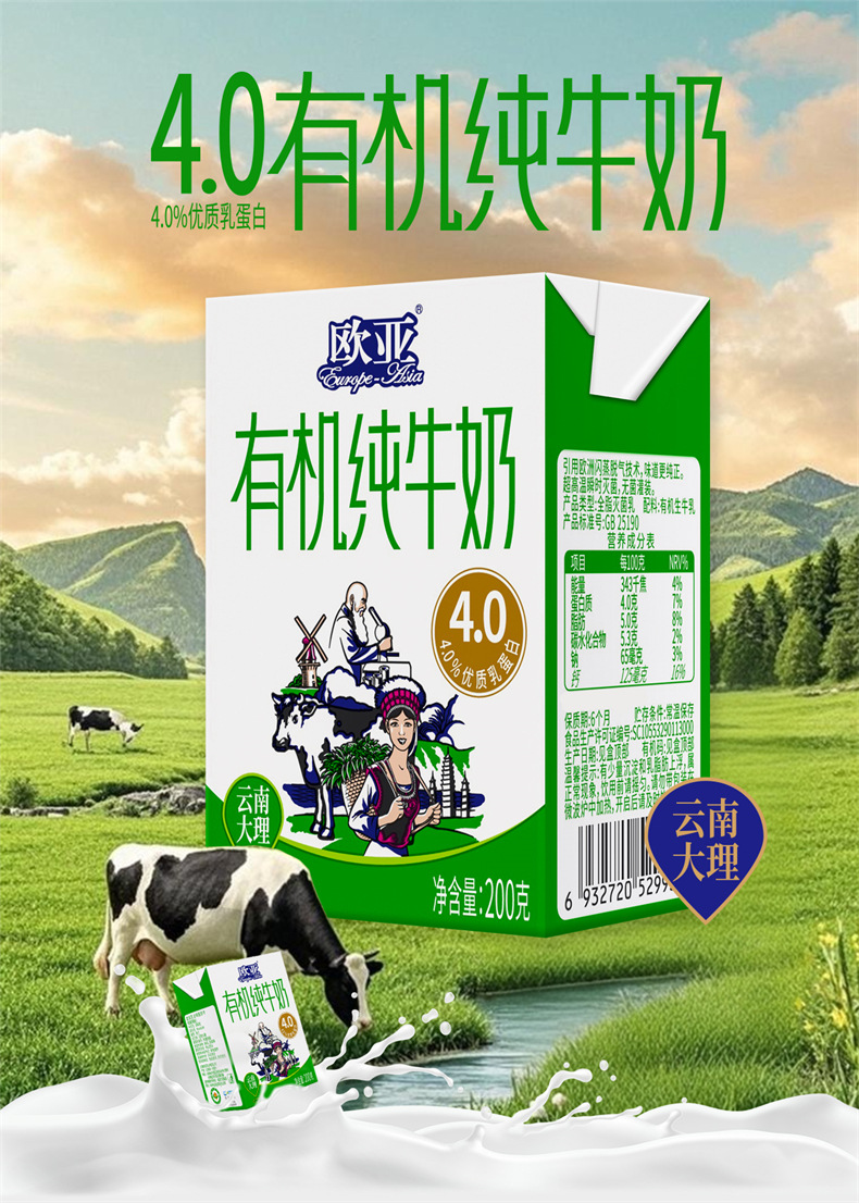 有机认证欧亚高原全脂有机4.0蛋白纯牛奶200g20盒大理乳制品