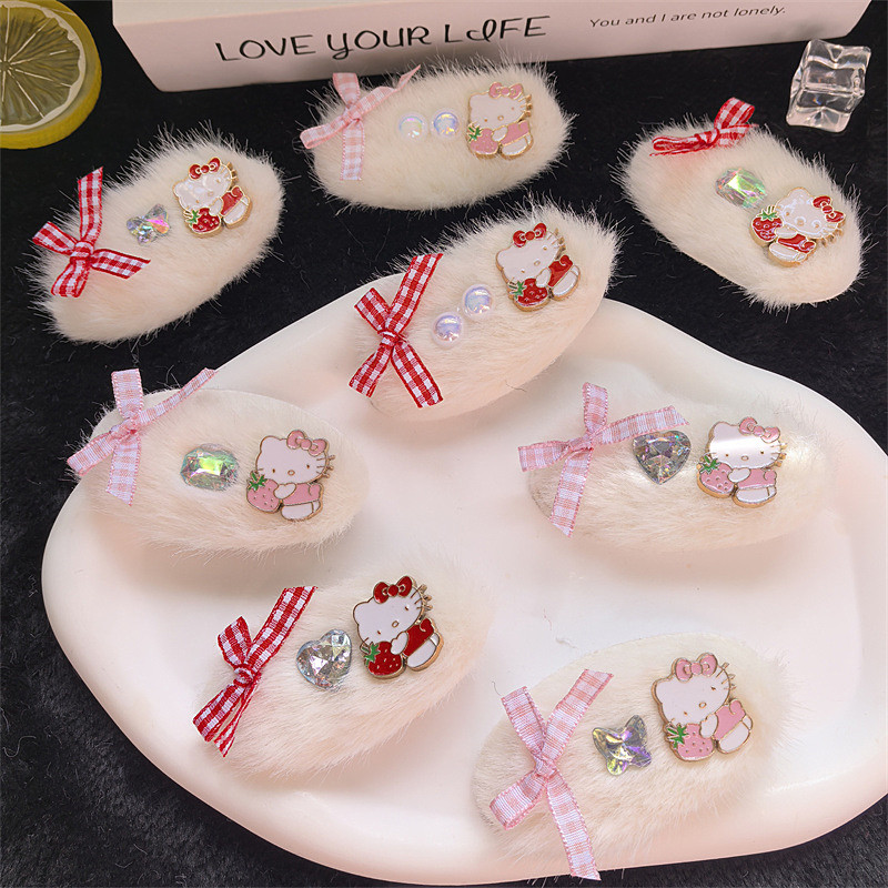 可爱毛绒草莓KT猫咪发夹秋冬款蝴蝶结甜美少女刘海碎发卡边夹头饰