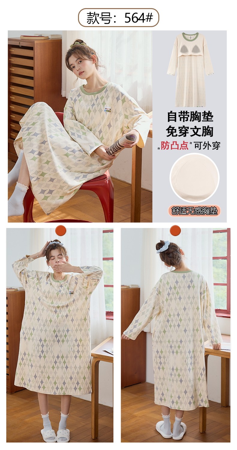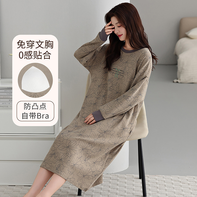 寝ているスカートの女性の春秋の長袖の純綿は胸のクッションの一体式を持っています。