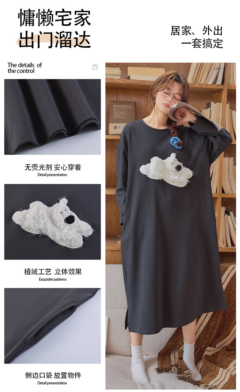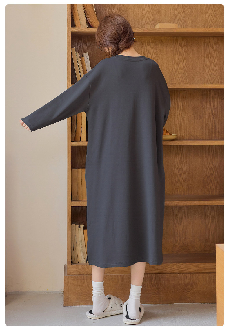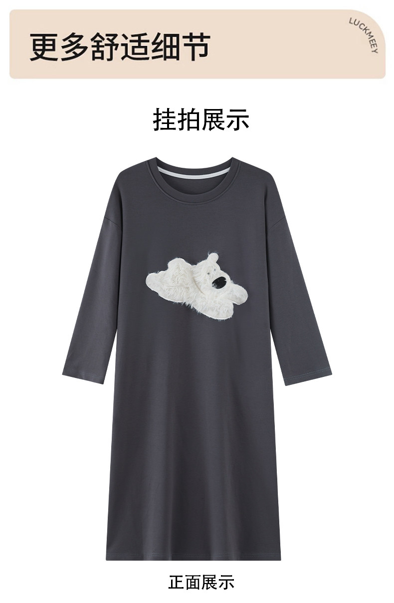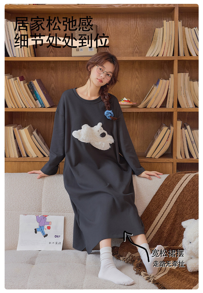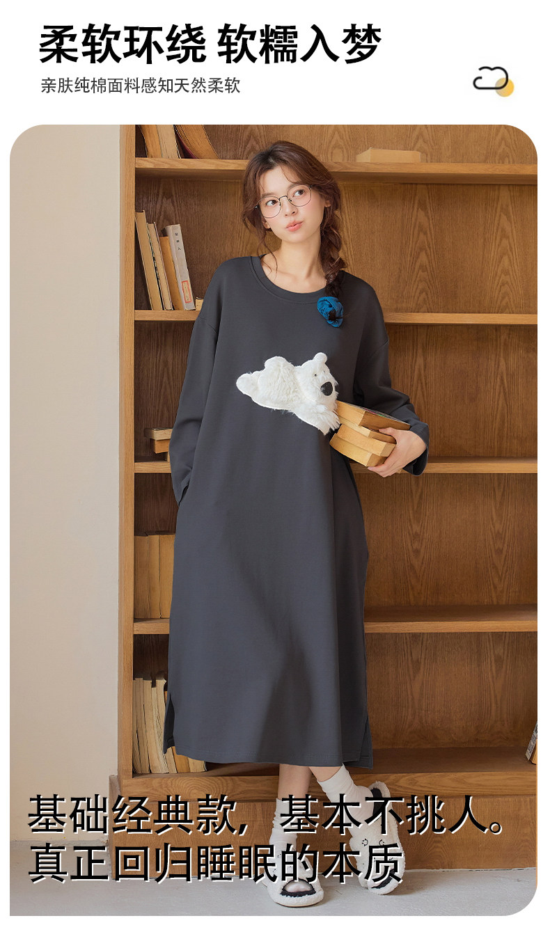 秋季新品彩棉螺纹睡裙女圆领长袖长款柔软莫代尔连衣裙纯色家居服