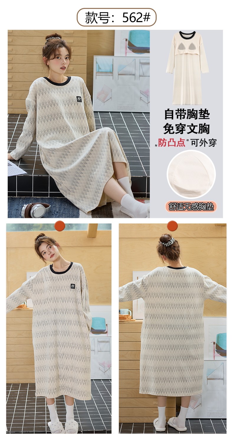带胸垫纯棉睡裙女春秋季圆领长袖简约高级感外穿2025家居服全棉