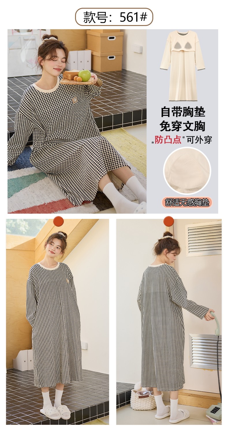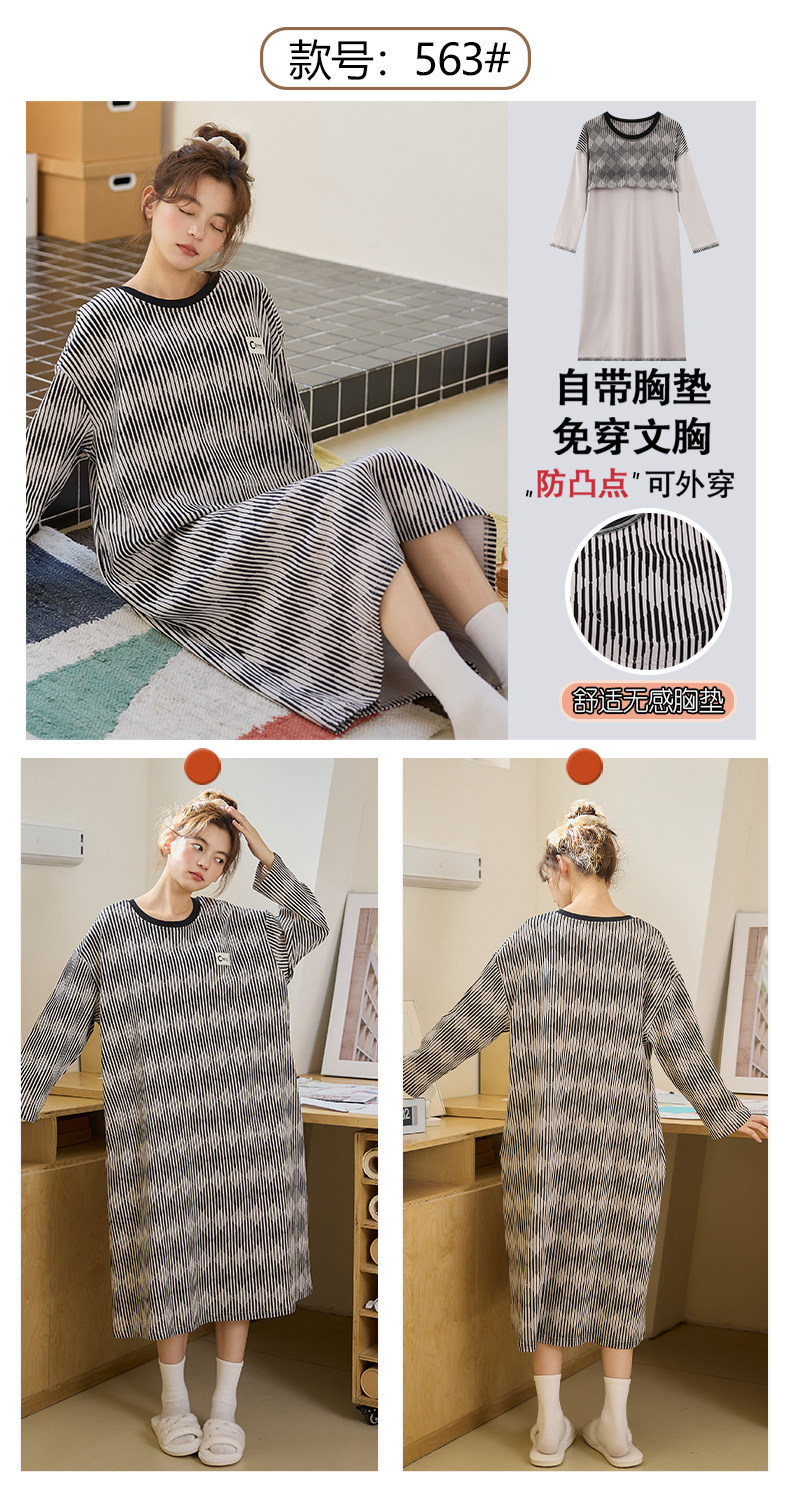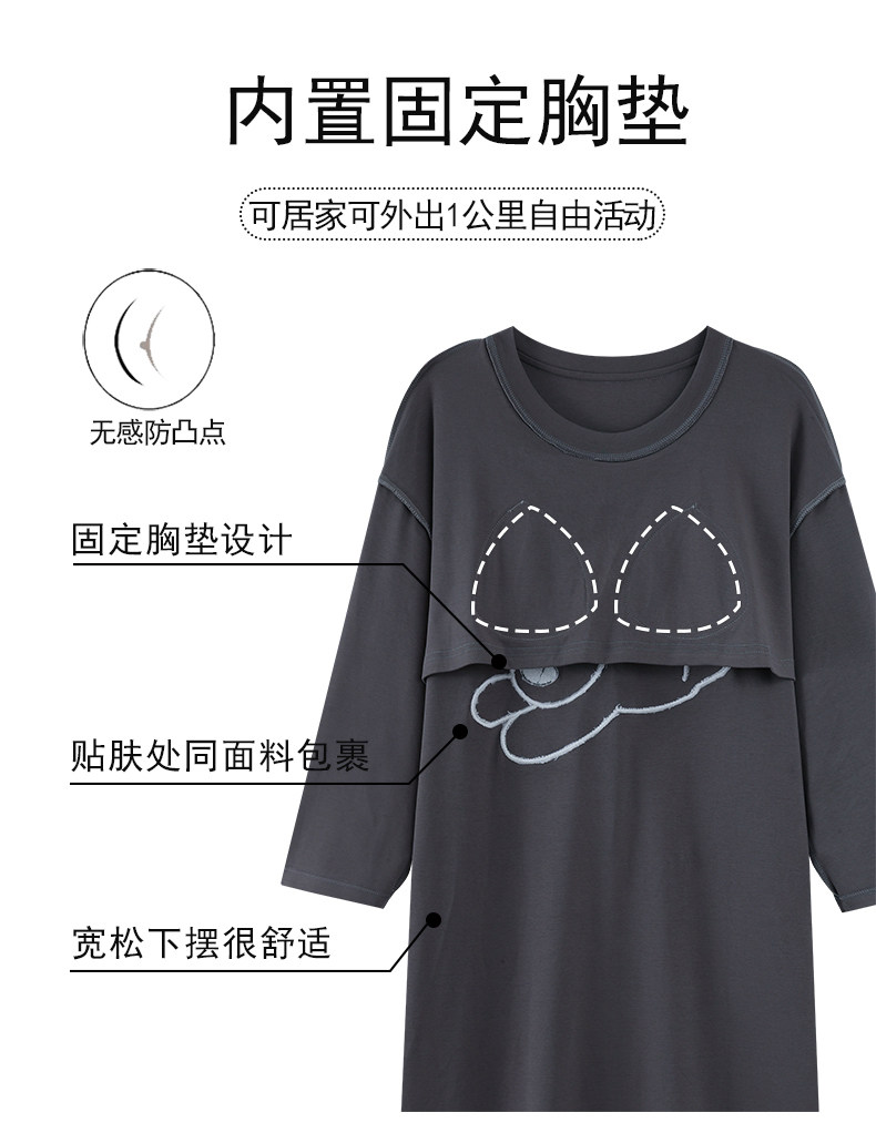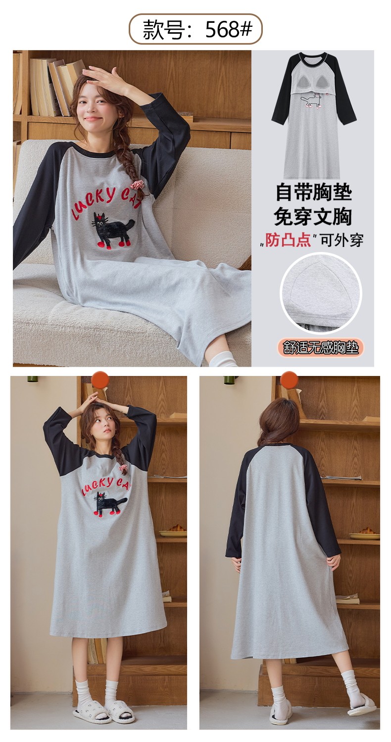 由果春秋冬季长袖纯棉睡裙女加胸垫2025年新款简约卡通家居服睡衣