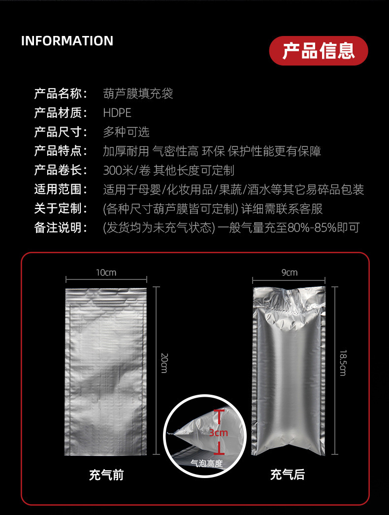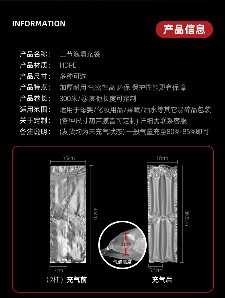 规格 二节泡40*15cm*300米(需充气机),四节泡40*25cm*300米(需充气机),填充袋20*20cm*500米,填充袋20*12cm*500米,填充袋20*15cm*500米,填充袋20*10cm*500米