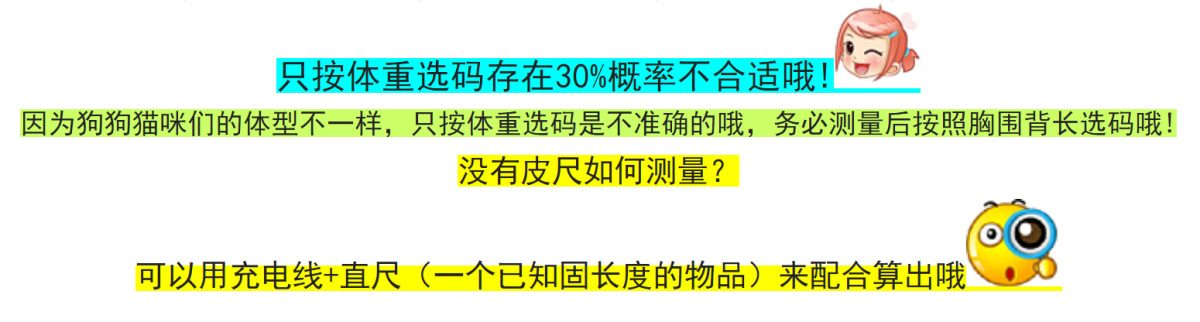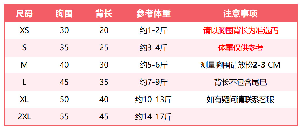 尺码 XS胸30背20约2-3斤,S胸35背25约4-5斤,M胸40背30约6-8斤,L胸 45背35约9-11斤,XL胸50背40约12-14斤