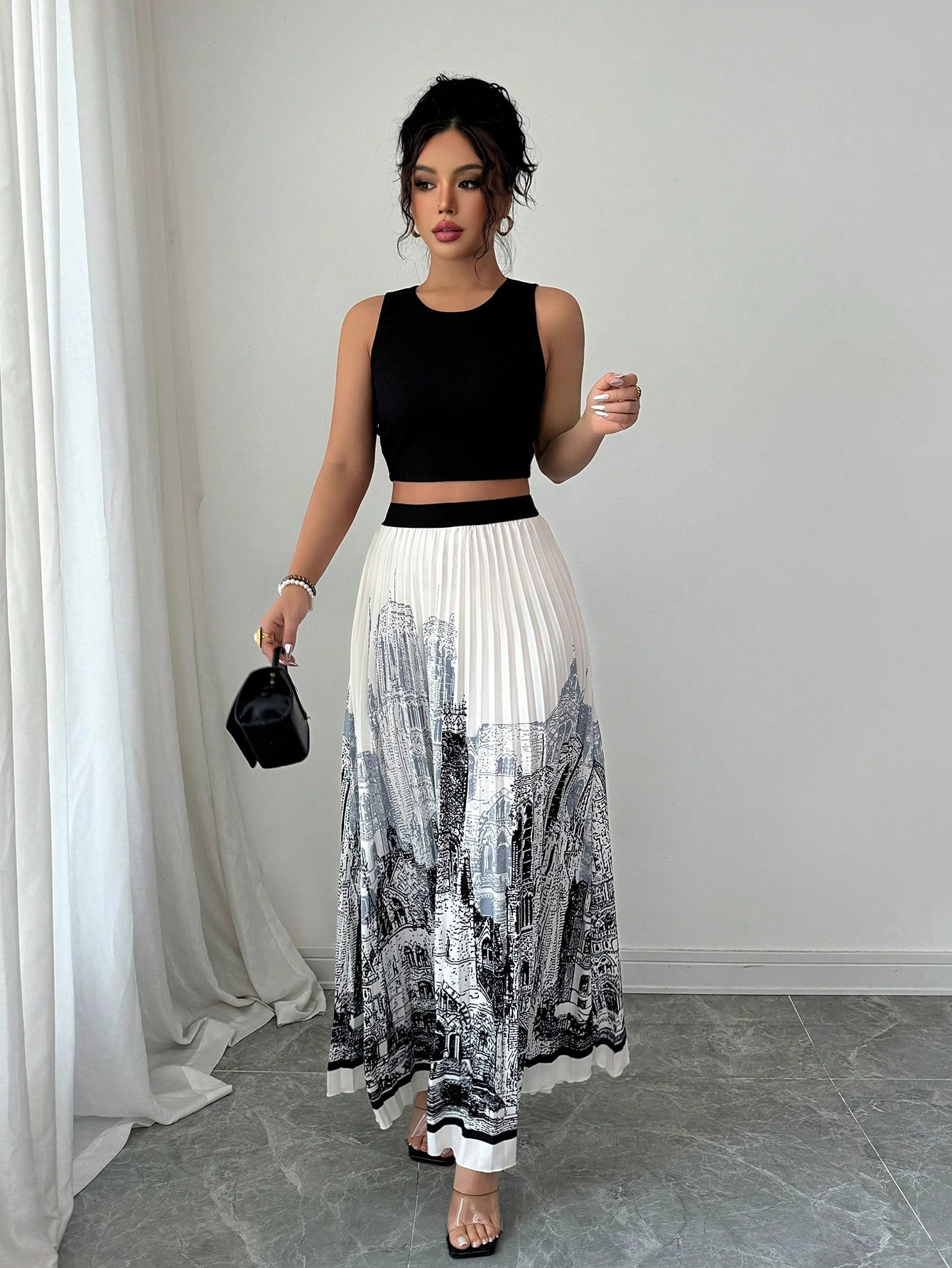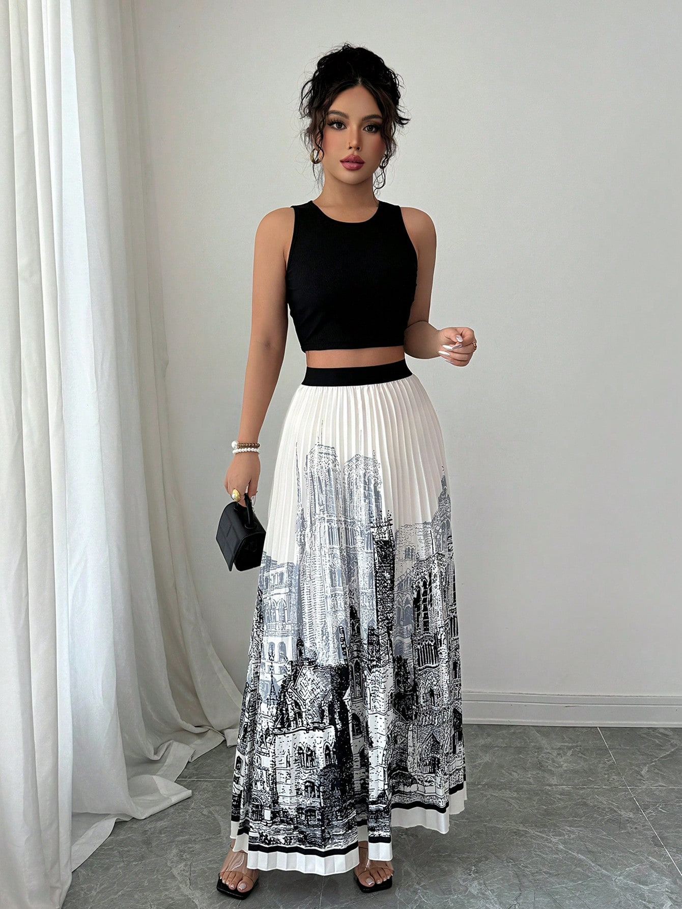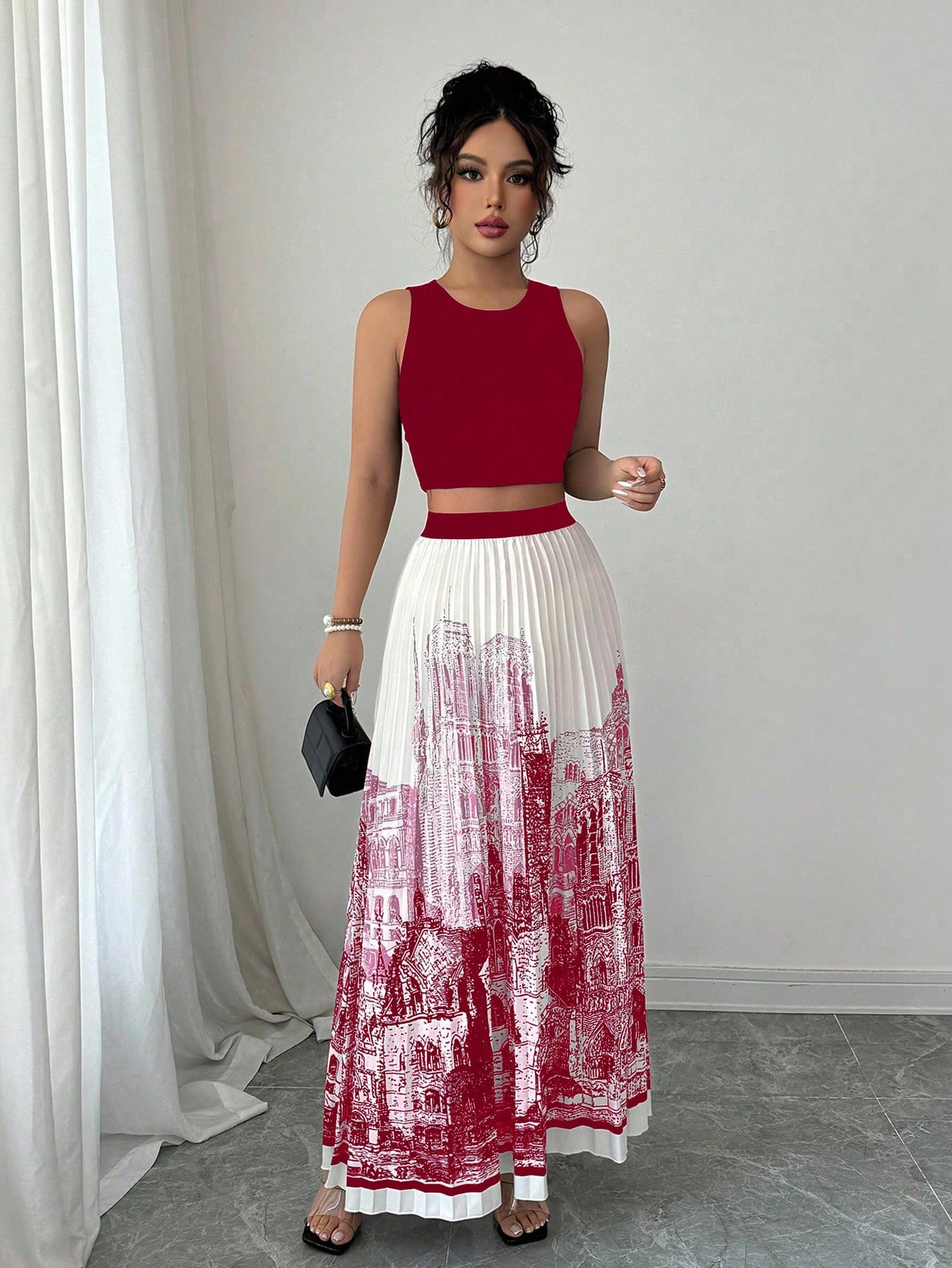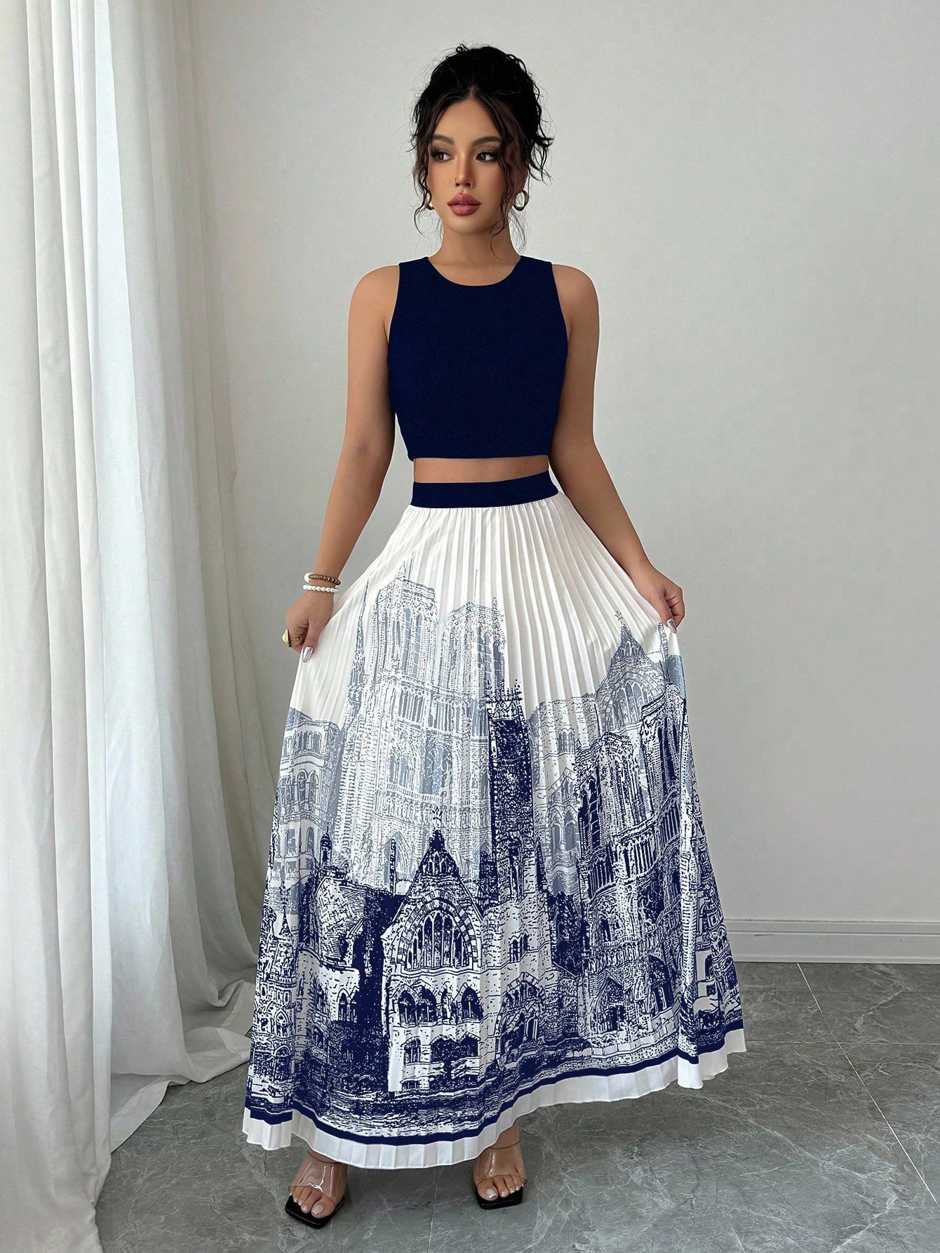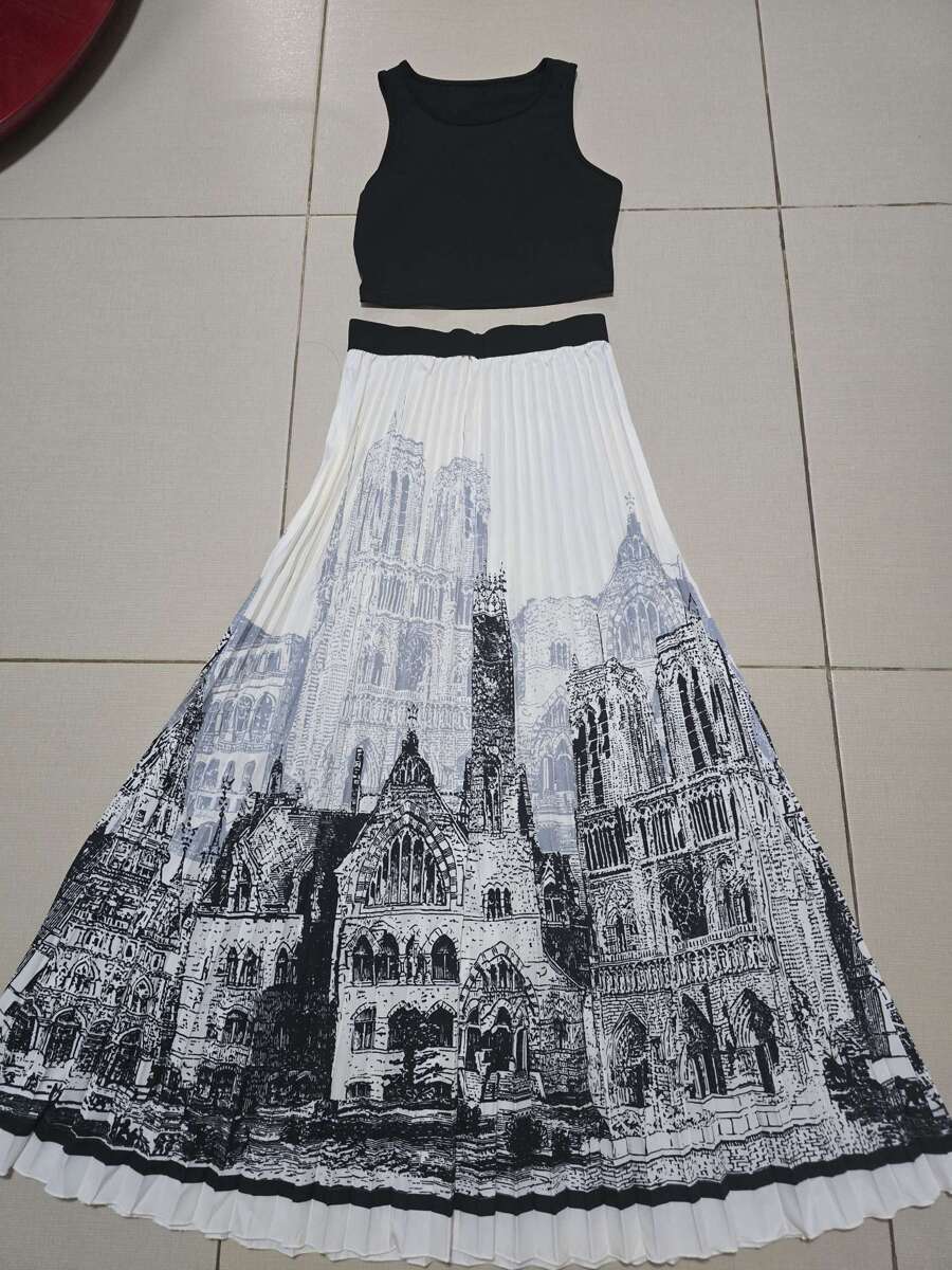 夏季水墨印花无袖长裙套装无袖纯色背心百搭百褶裙两件套
