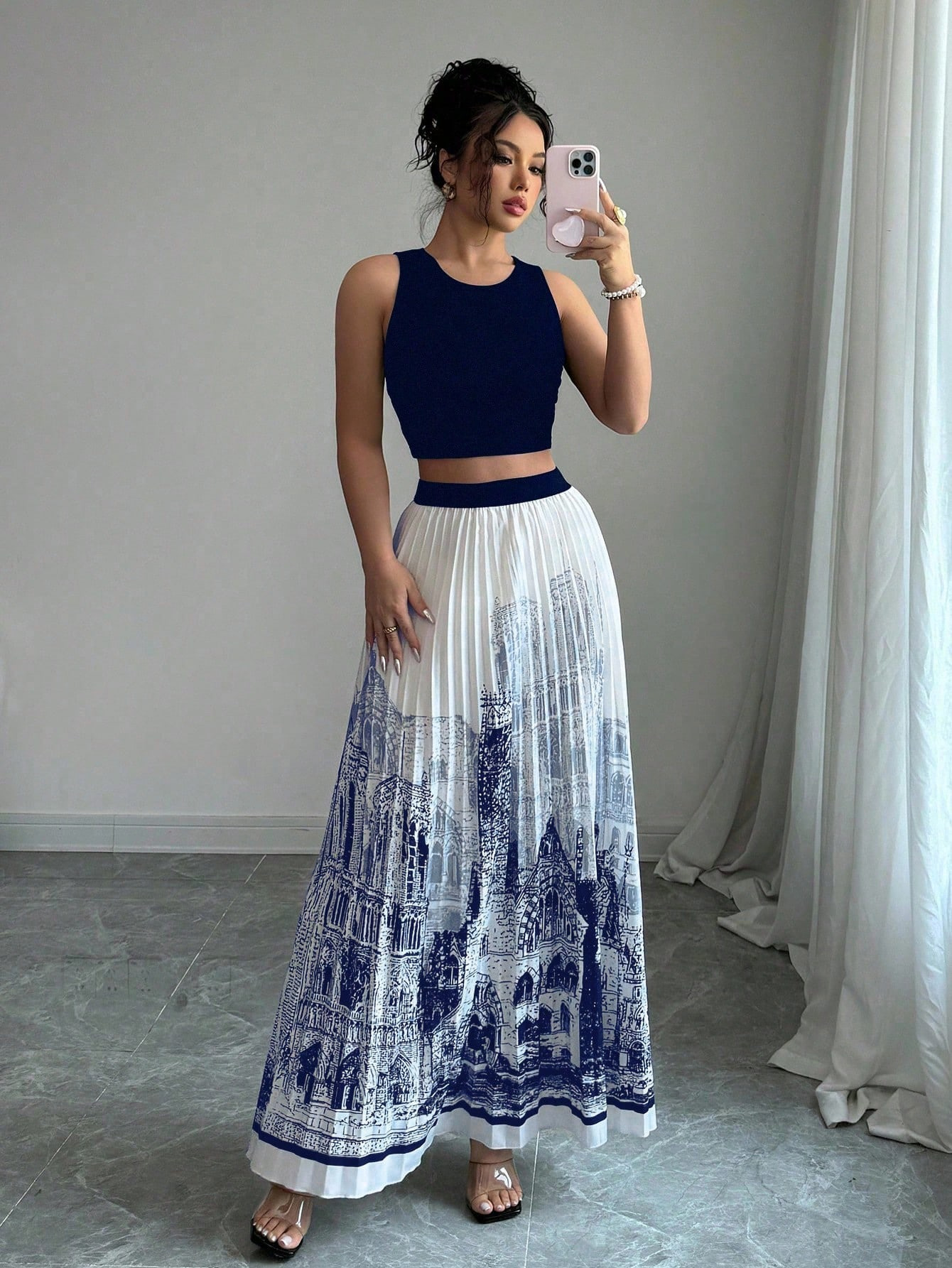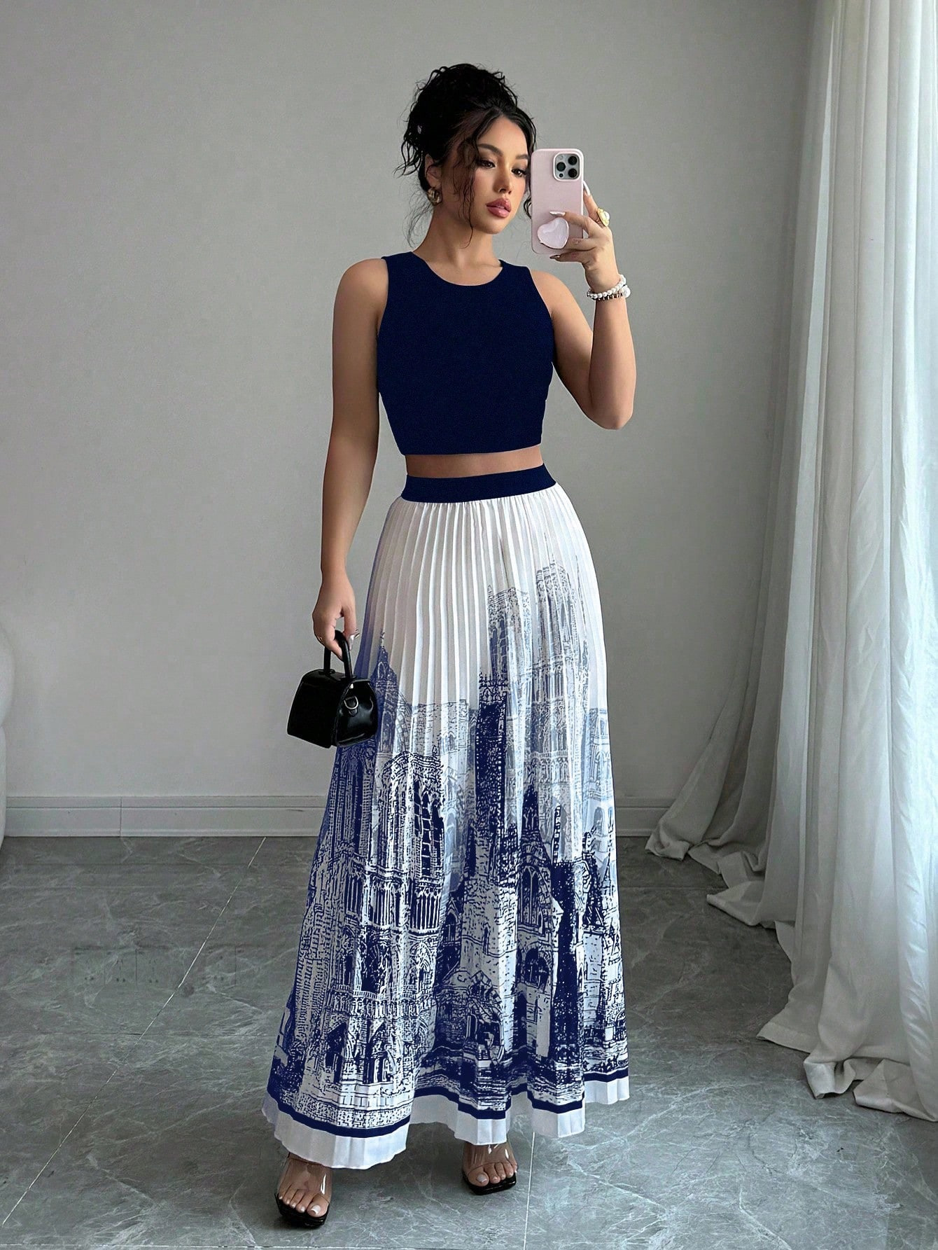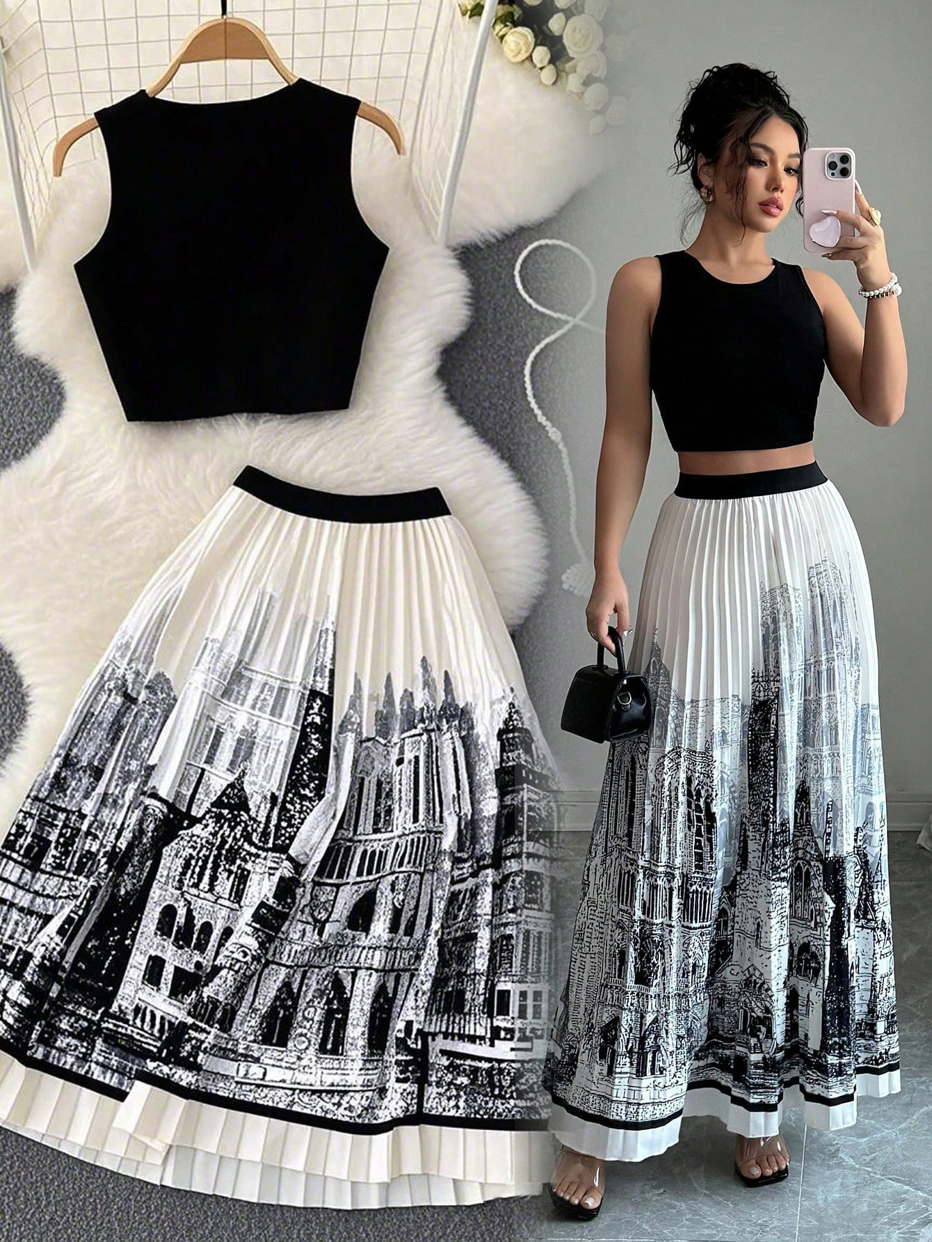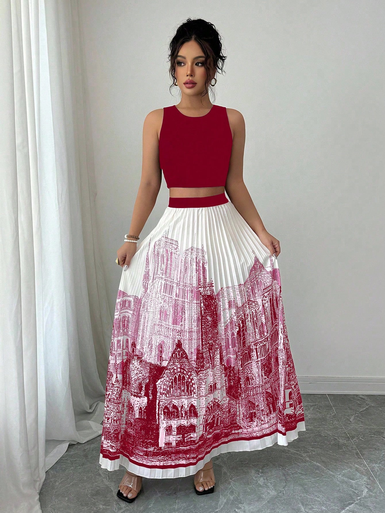 夏季水墨印花无袖长裙套装无袖纯色背心百搭百褶裙两件套
