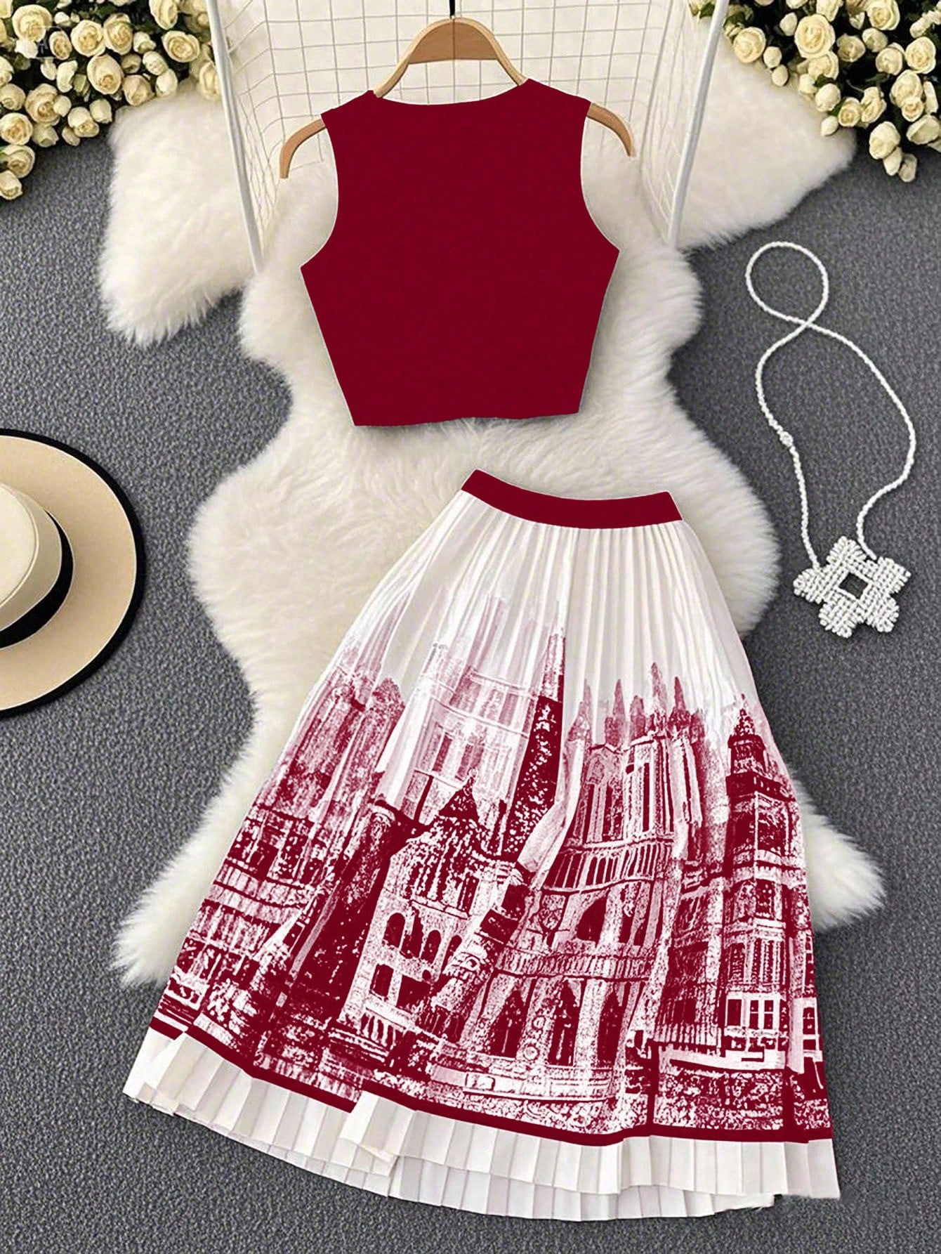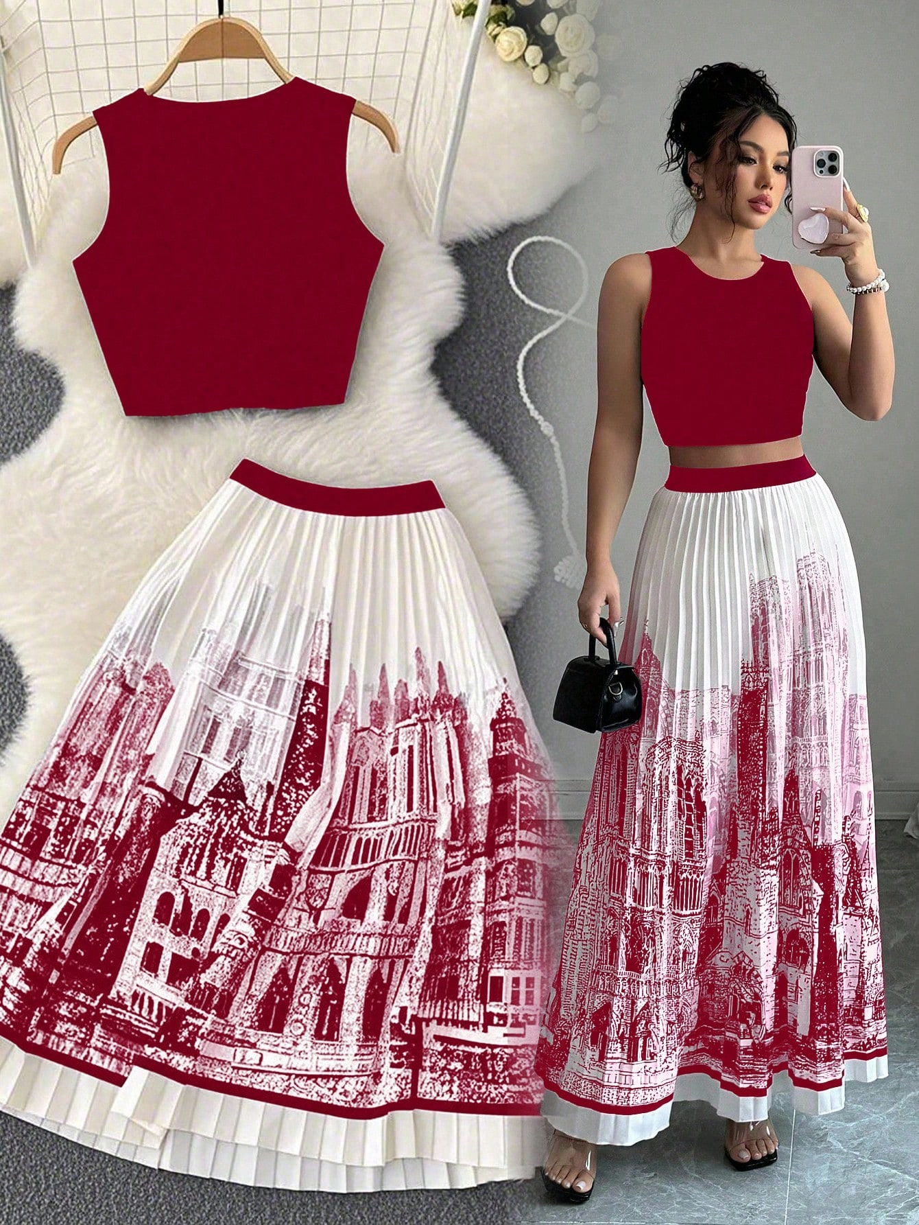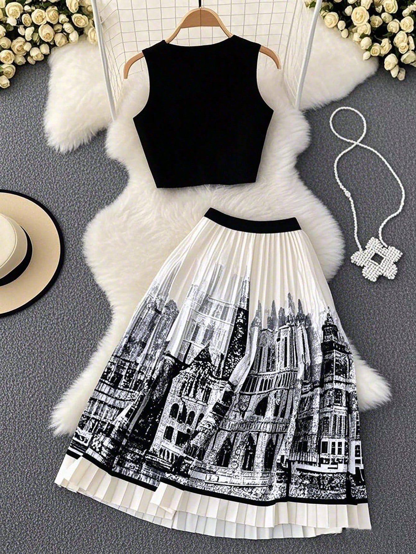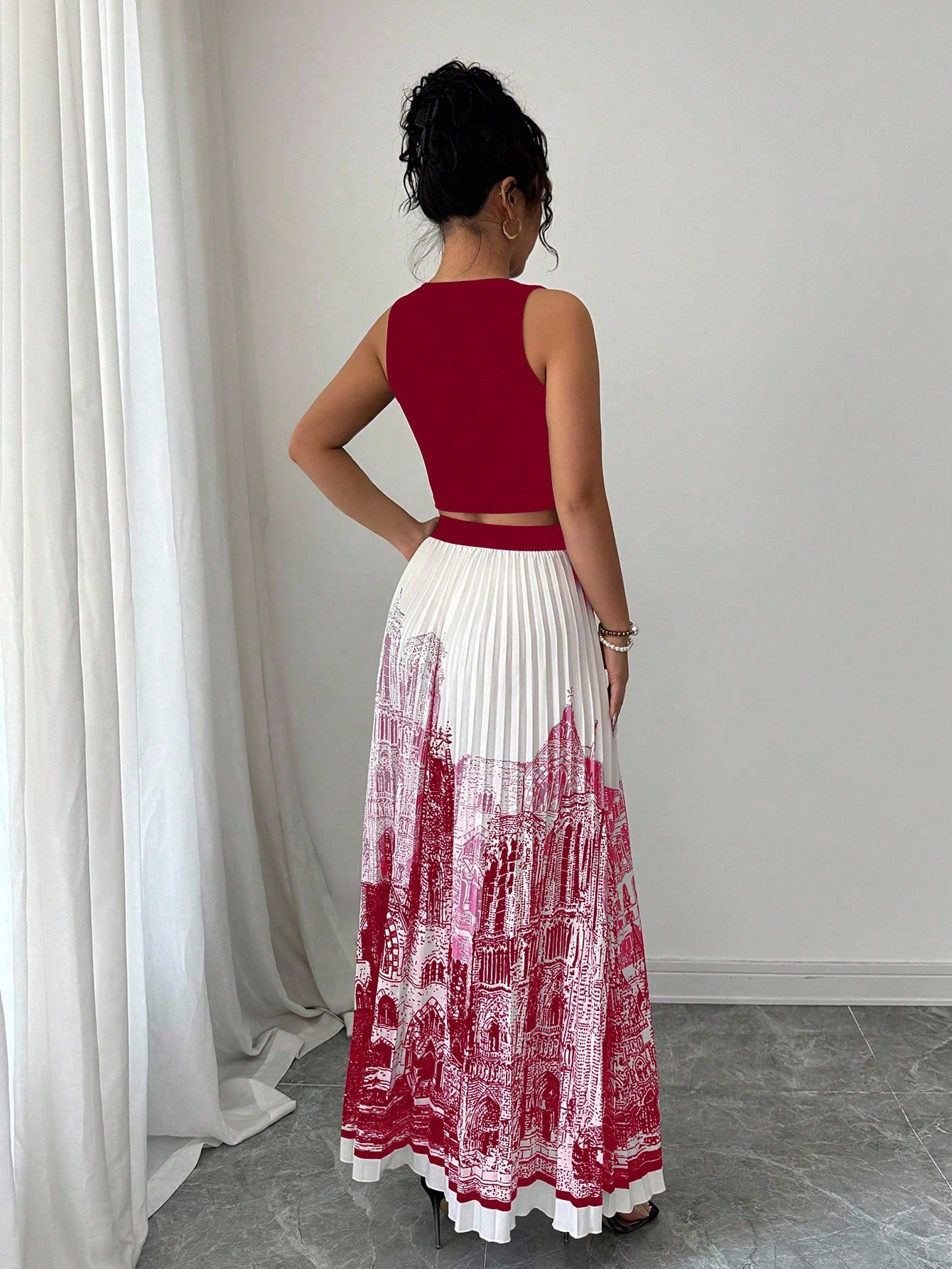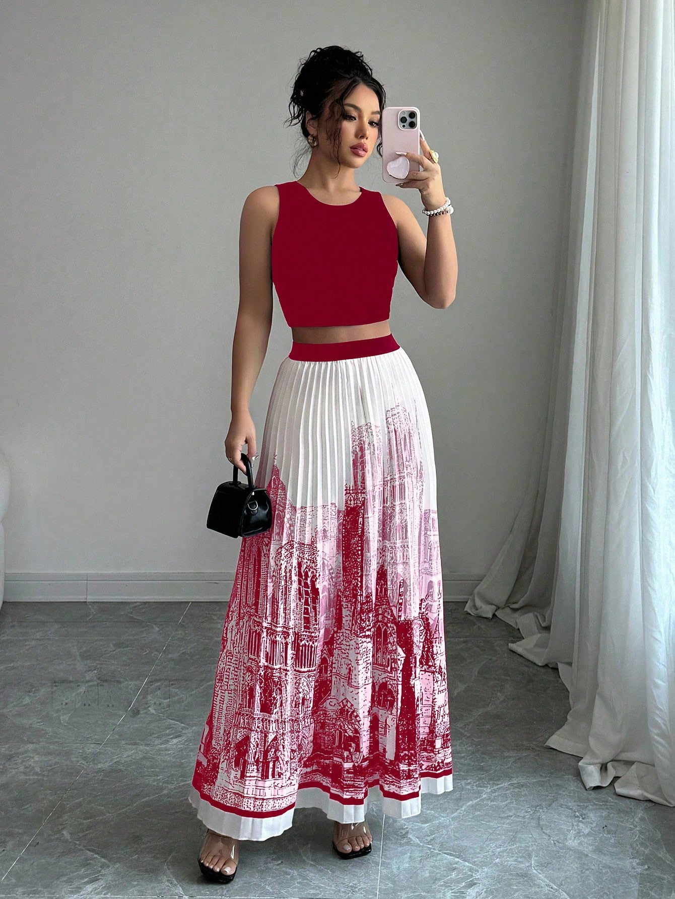 夏季水墨印花无袖长裙套装无袖纯色背心百搭百褶裙两件套