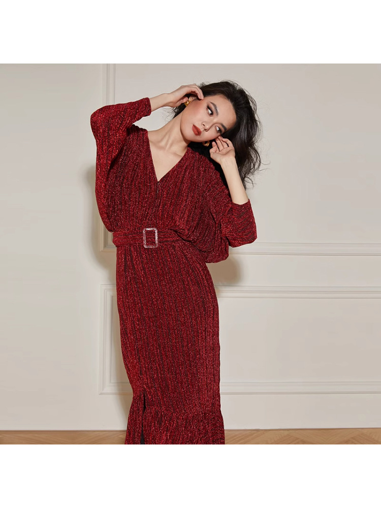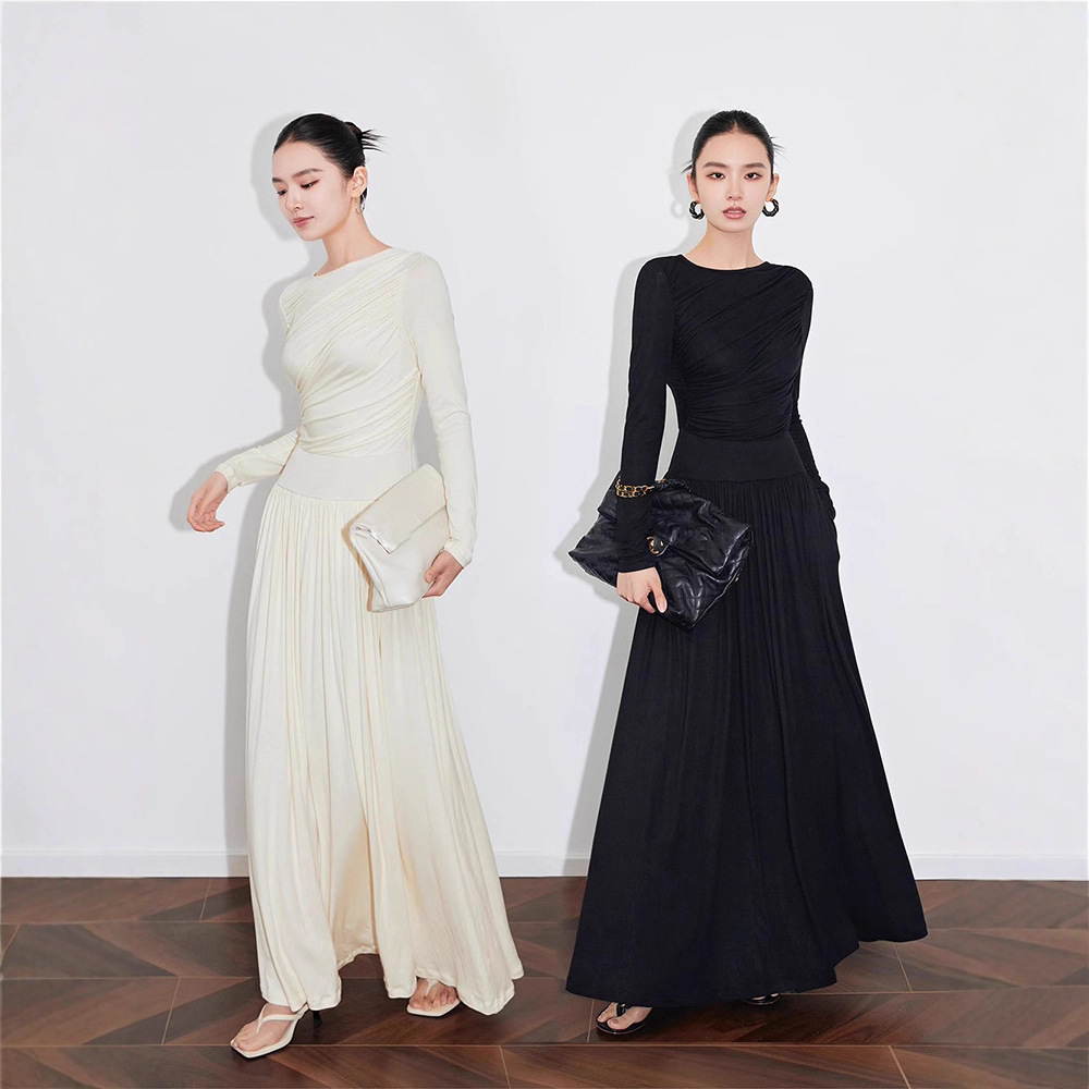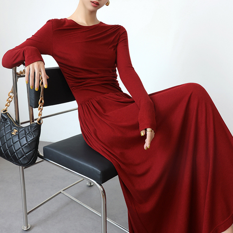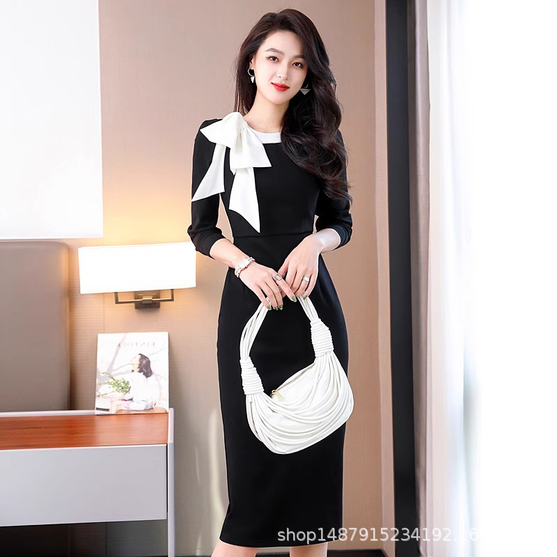 新款长袖小香风气质修身长款连衣裙优雅高雅弹力针织款礼服批发