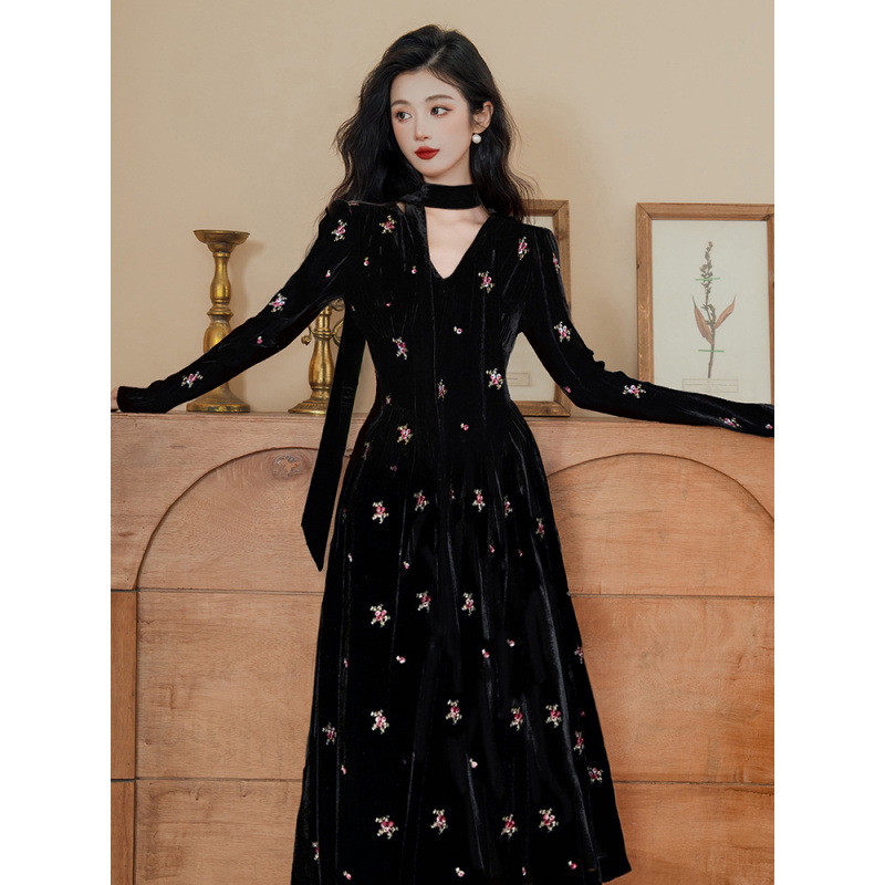 フレンチレトロ風黒ベルベットワンピース レディース 2025秋冬 高級感 気質 大人御姐風 スリムロングスカート