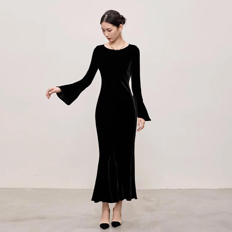 2025秋冬 エレガントで高級感のあるイブニングドレス 長袖 スリムロングドレス レディース ヴィンテージ風ベルベットワンピース ブラック フィッシュテール