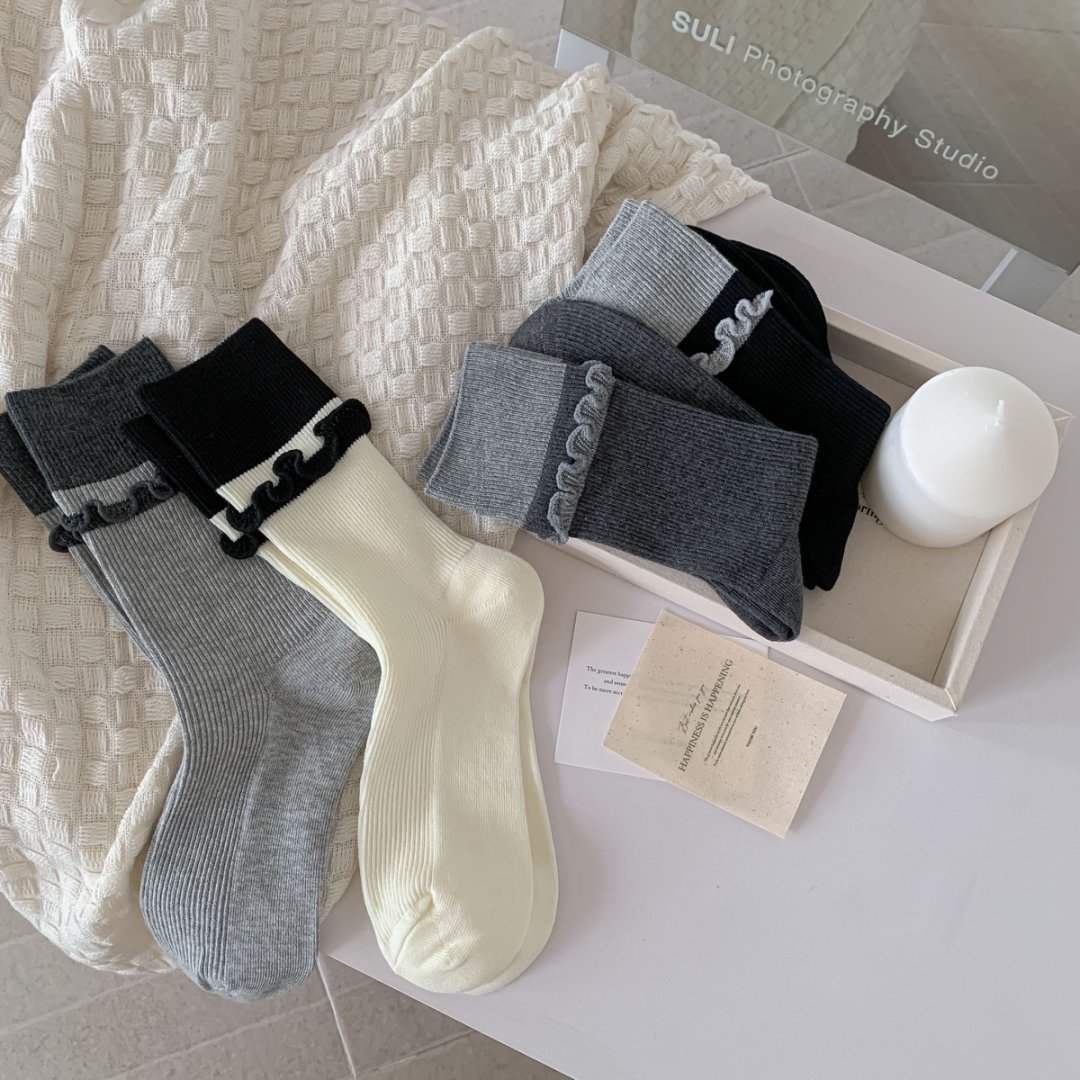 秋冬纯色条纹中筒袜木耳边学院风堆堆袜日系简约百搭基础款棉袜子
