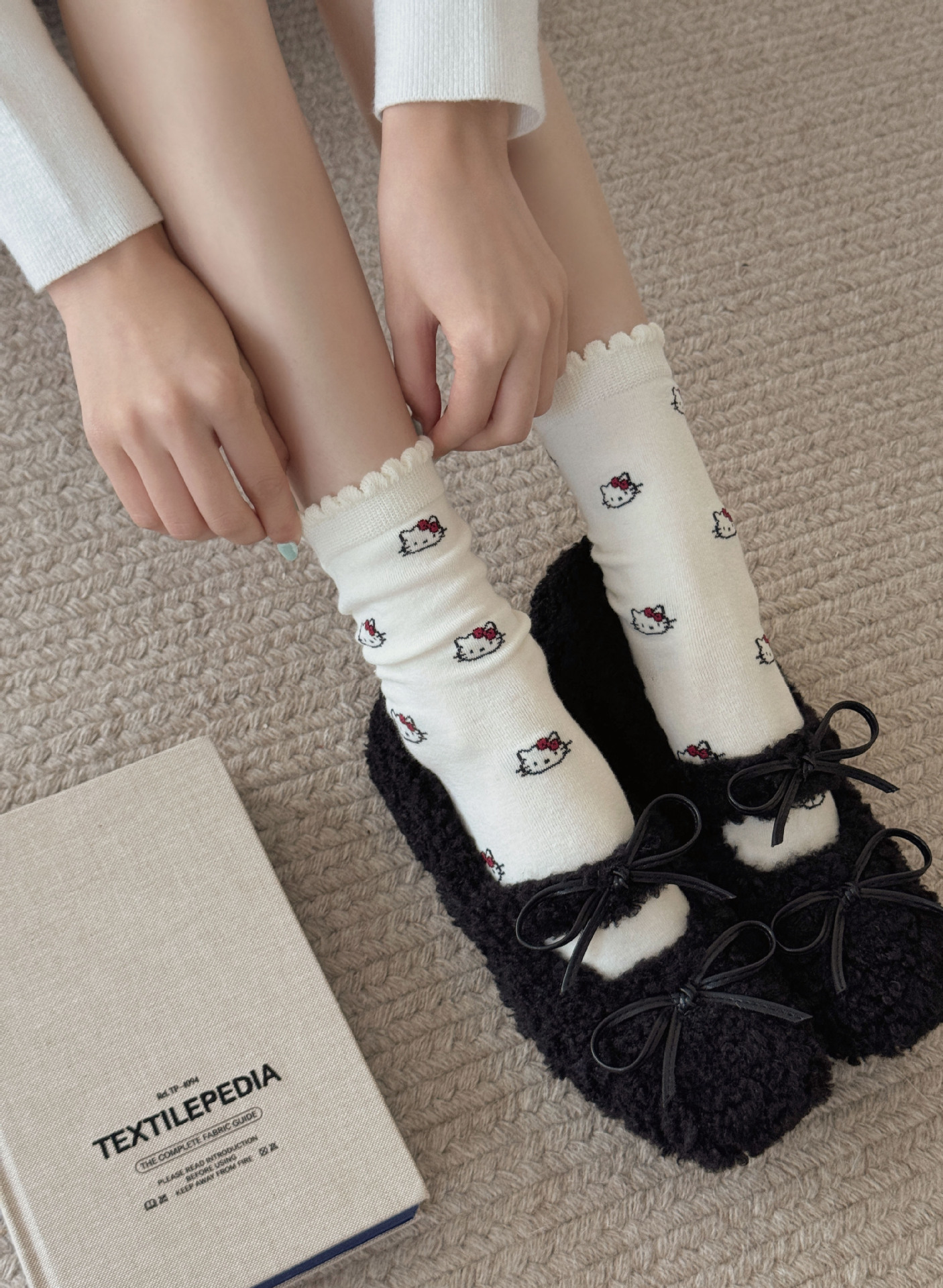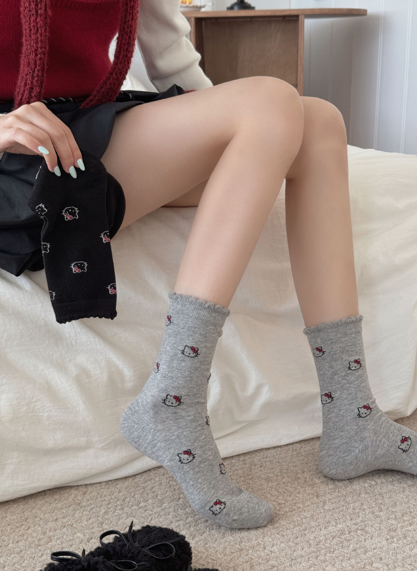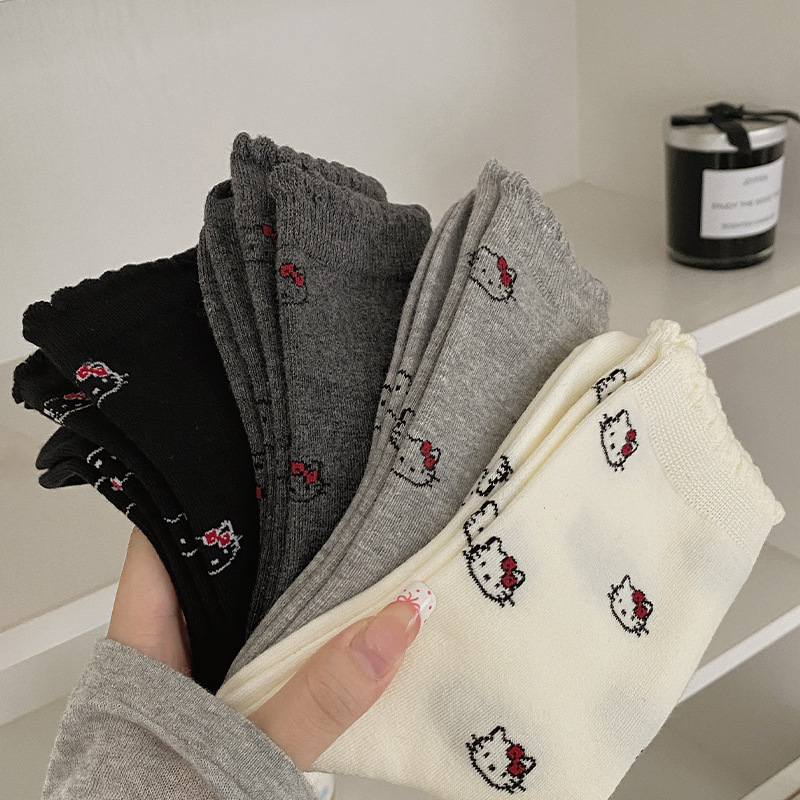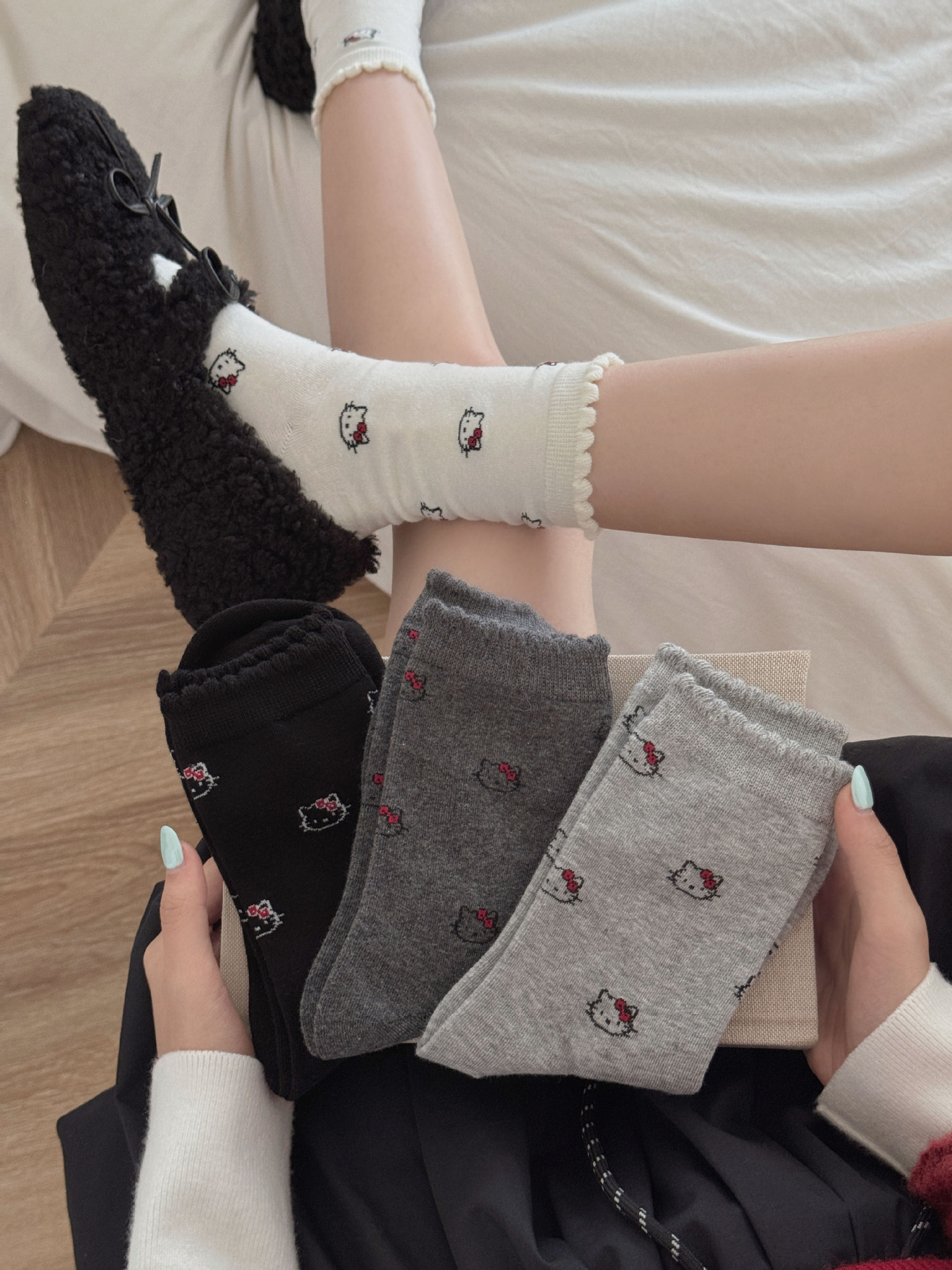 秋冬新款刺绣kitty猫袜子女卡通堆堆袜ins潮流学院风泡泡口袜子