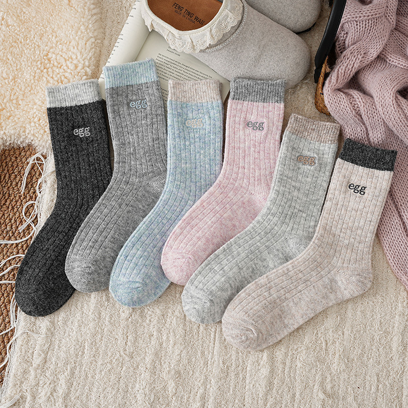 秋冬加绒加厚保暖羊毛袜子女拼色中筒袜刺绣字母复古诸暨袜子批发