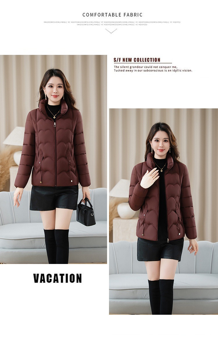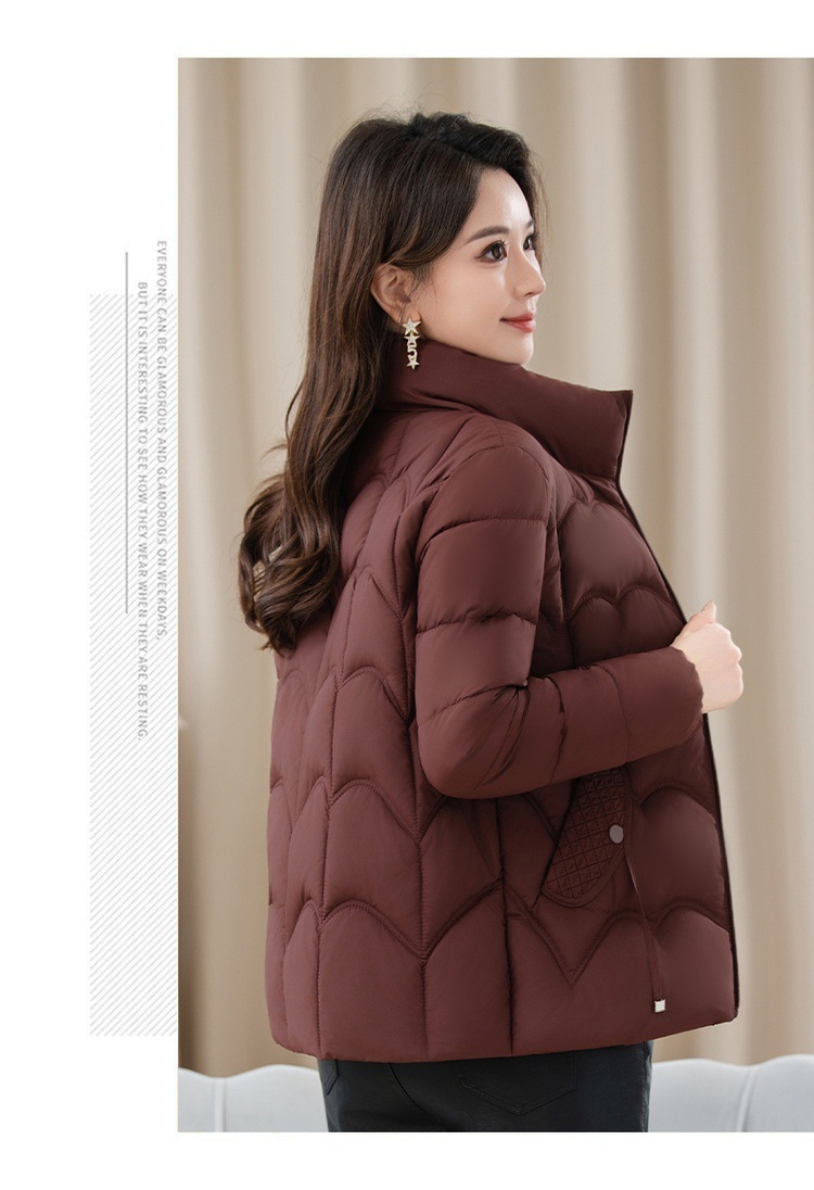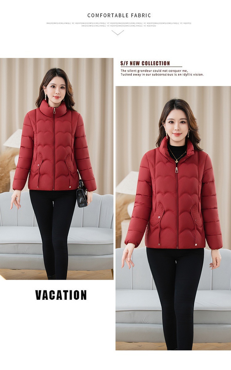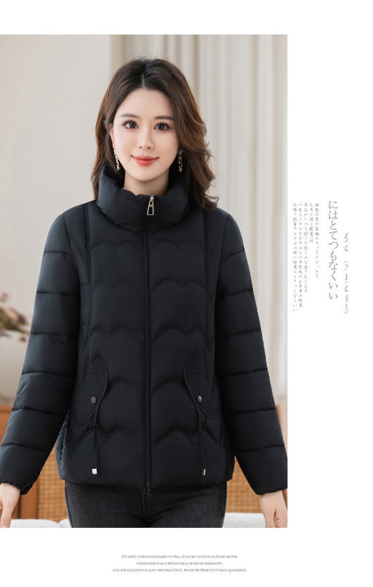 冬用厚手コート、ショート丈中年女性向けスタンドカラー中綿ジャケット、冬用ママ向け防寒コート、流行の防寒着