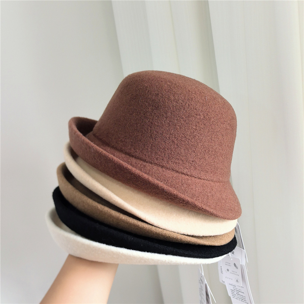 日系羊毛呢卷边渔夫帽女秋冬纯色百搭保暖盆帽显脸小气质卷边礼帽
