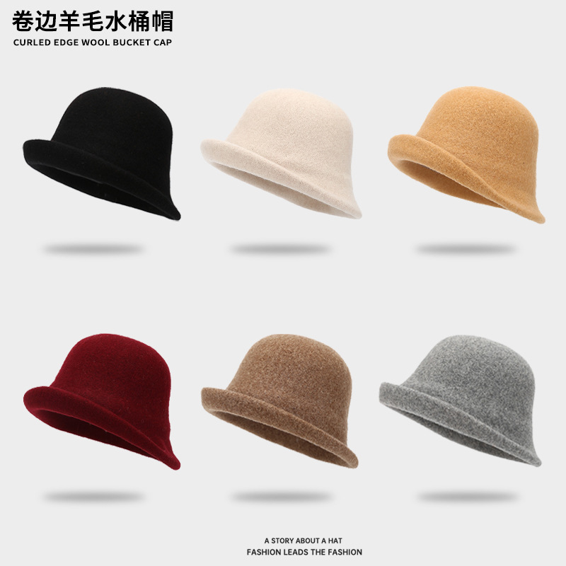 日系百搭羊毛卷边渔夫帽子女秋冬时尚保暖盆帽显脸小优雅气质礼帽