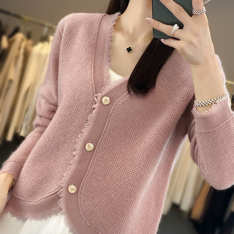 フランスの甘い優しい風のニットのカーディガンの女性のvネックの独特な大衆のデザイン感の柔らかいモチモチの長袖のセーターのコートの女性