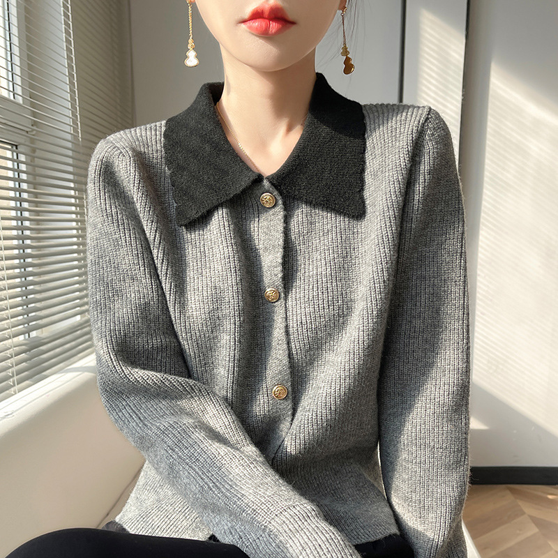 秋冬新款小香风撞色翻领针织开衫女抽条百搭长袖毛衣时尚外套上衣