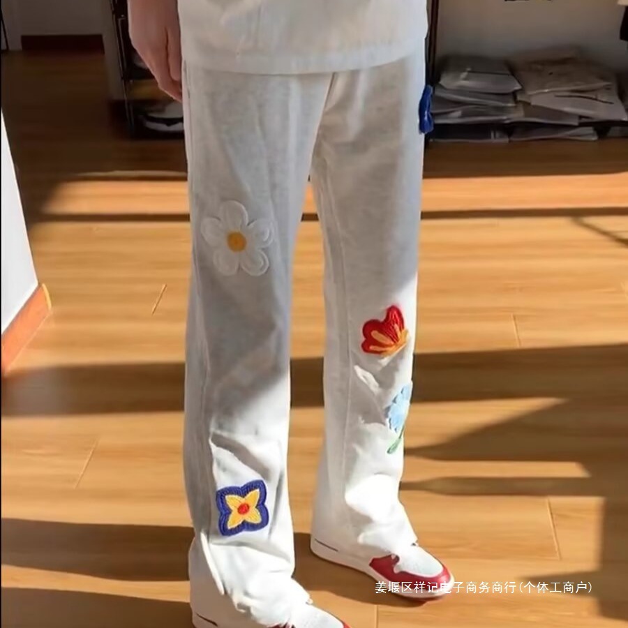 夏のベーシックな花柄刺繍ヘビードレープハイストリートヒップホップストレートルーズスウェットパンツ男性と女性用カジュアルパンツ