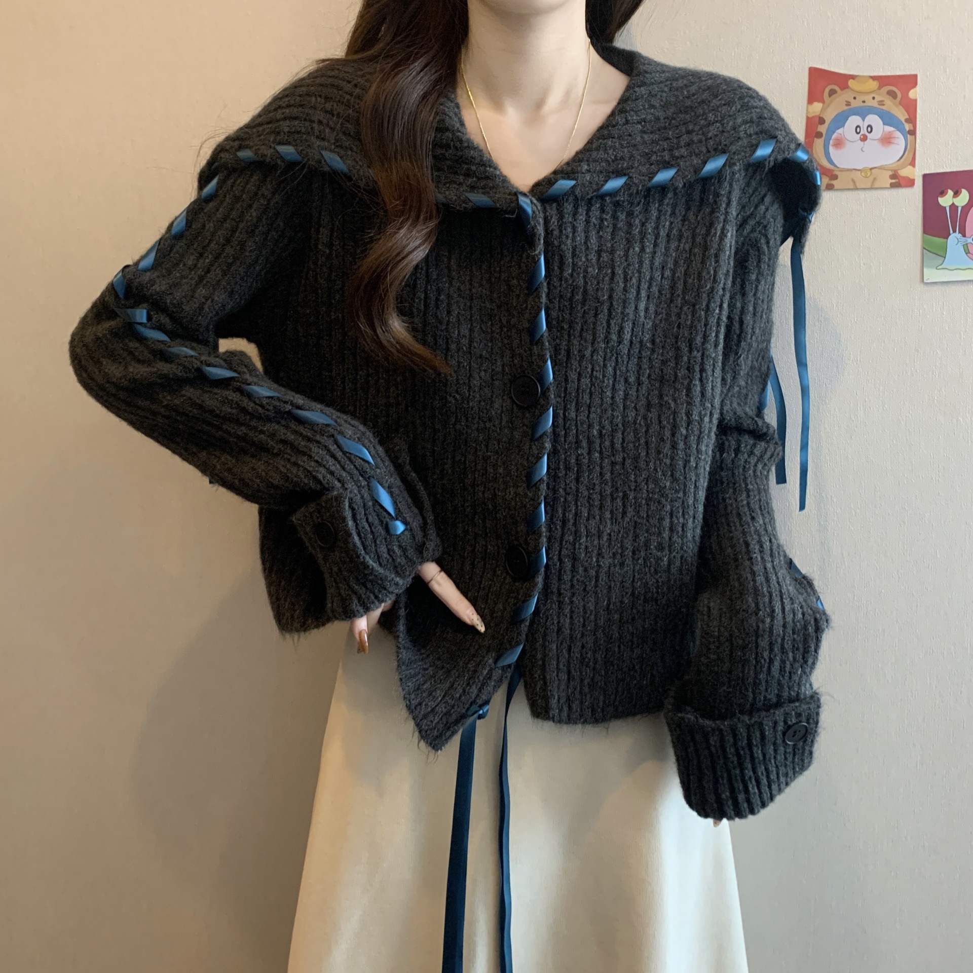 法式小香风秋冬新款外套 串绳设计时尚海军领 翻袖针织毛衣女开衫