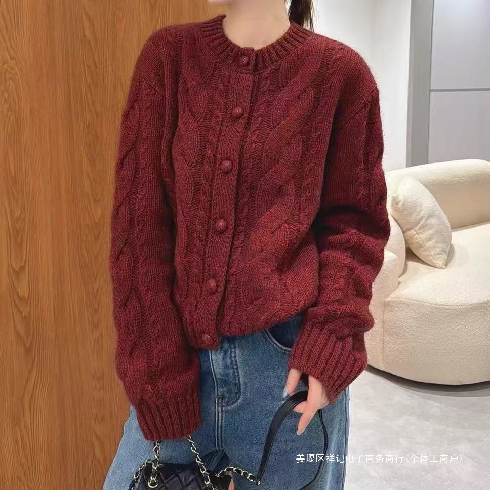 /麻花热红酒开衫/圆领麻花编织针织开衫外套红色均码其它无袖冰丝