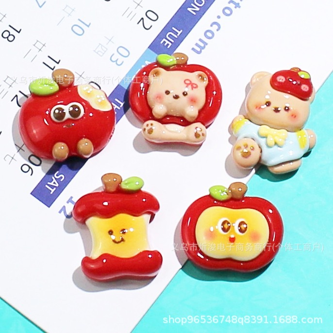亮面红苹果小熊食玩树脂配件卡通发夹手机壳钥匙扣水杯鞋子奶油胶