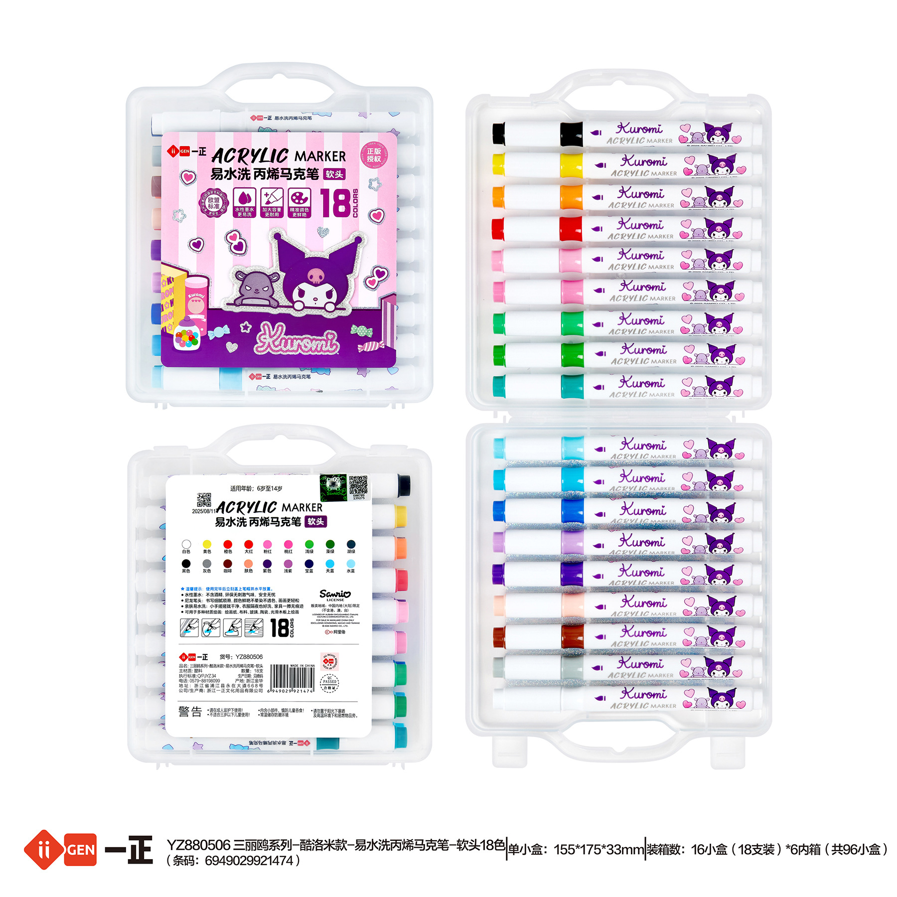 iigen一正文具三丽鸥形象易水洗丙烯马克笔单头软头18色儿童彩笔
